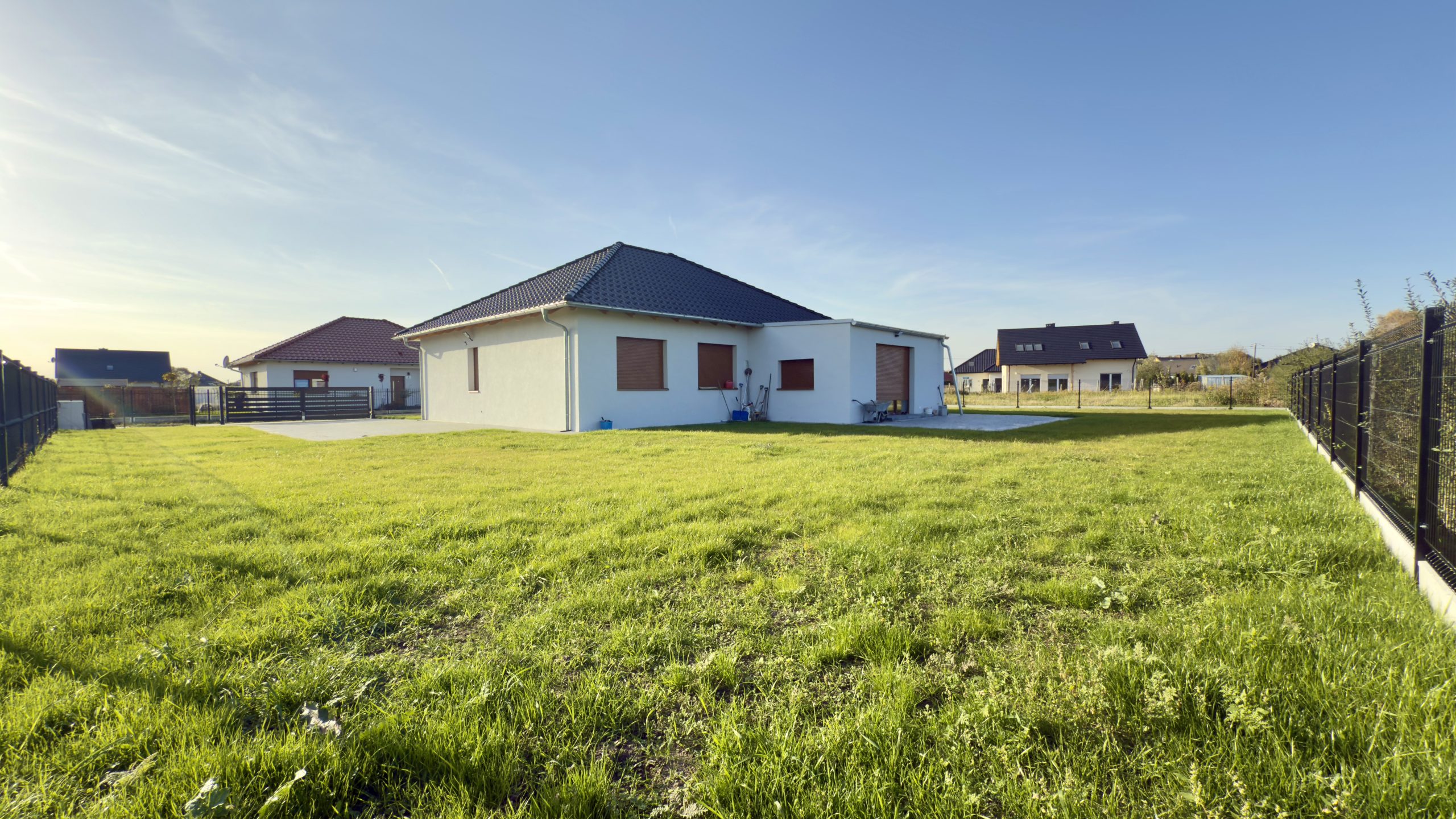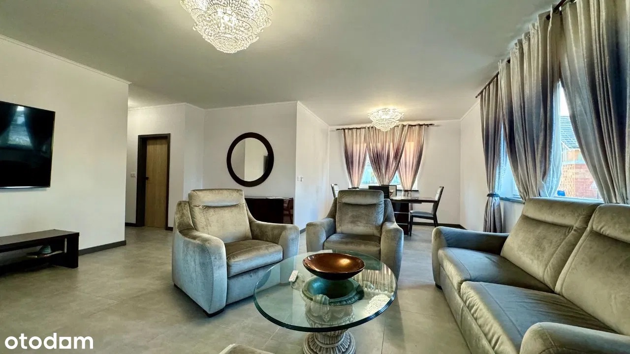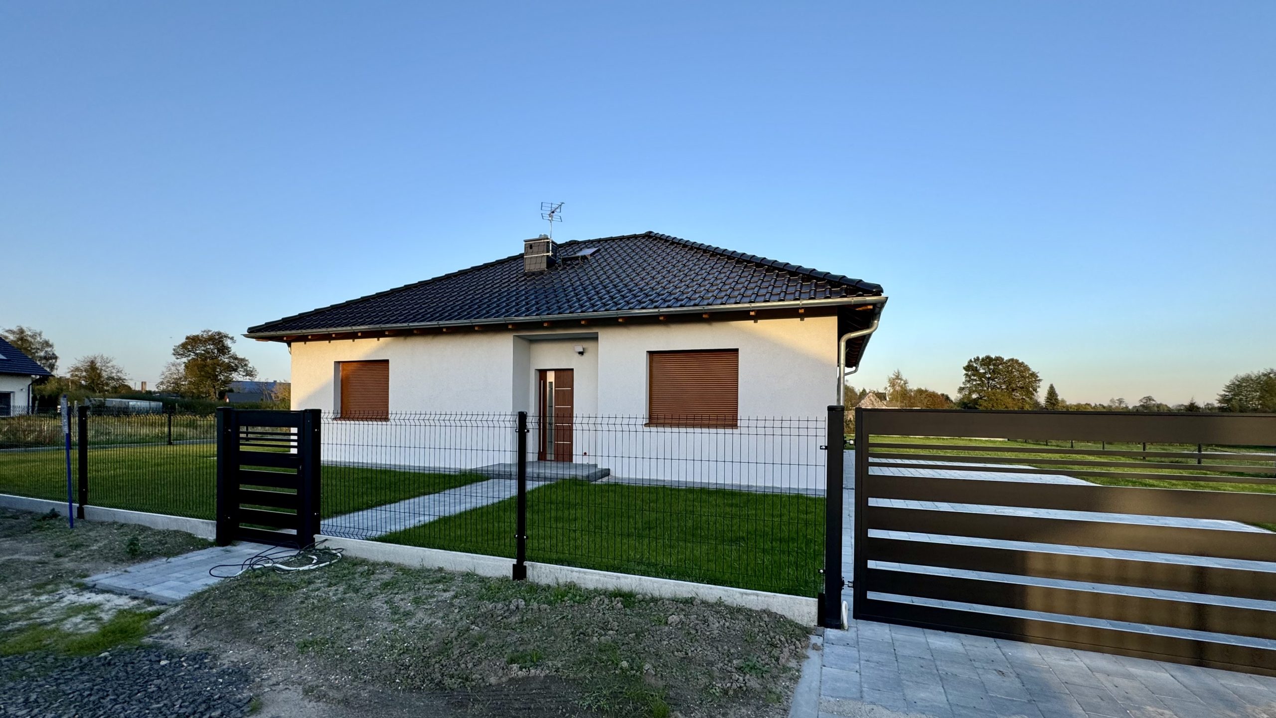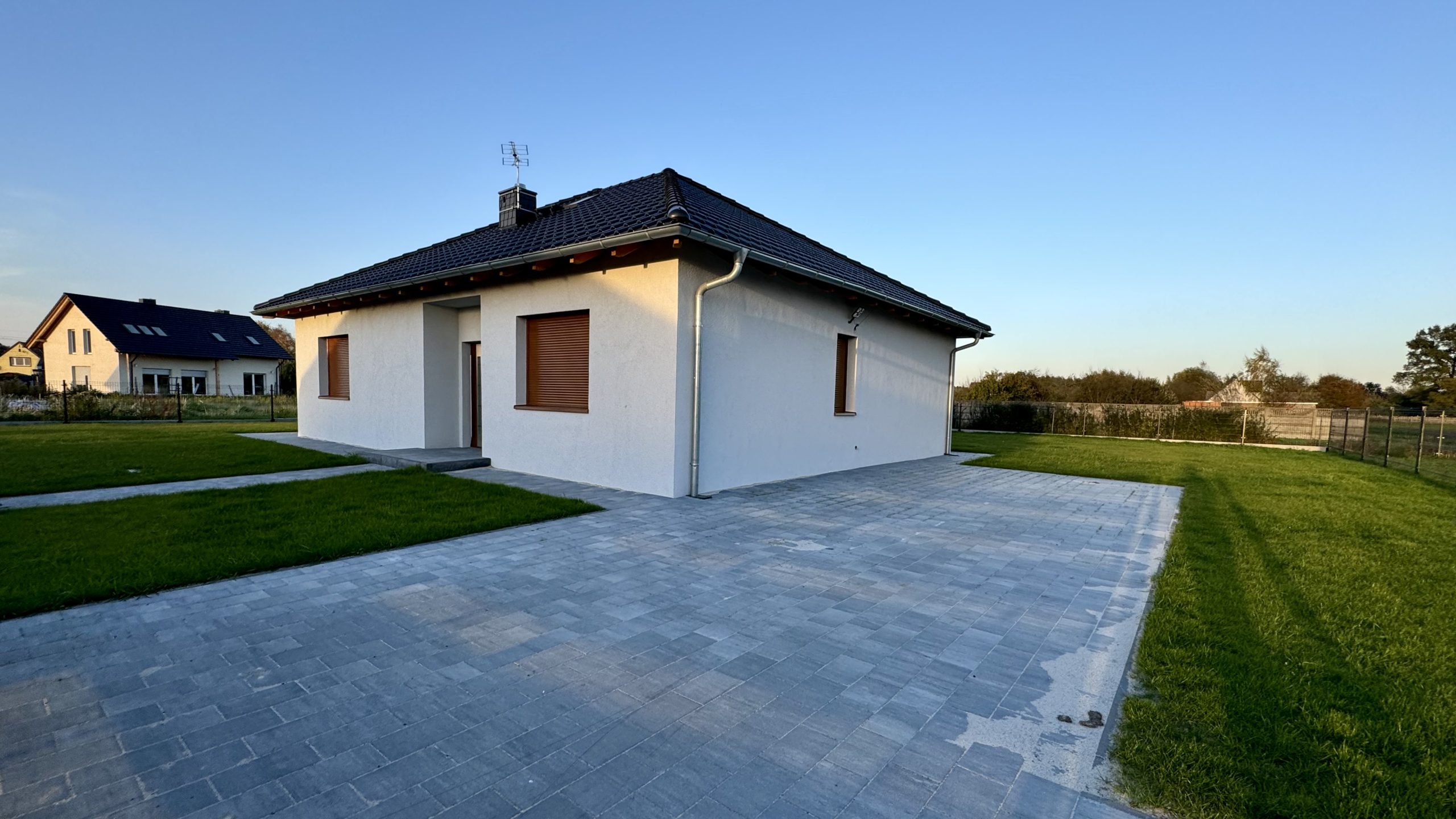 W całym budynku zamontowano ogrzewanie podłogowe zasilane powietrzną pompą ciepła. Okna wyposażono w elektrycznie sterowane rolety zewnętrzne, co dodatkowo podnosi funkcjonalność domu. Dach wielospadowy został pokryty dachówką ceramiczną, a taras oraz otoczenie budynku wykończono estetyczną kostką brukową. Działka jest w pełni ogrodzona i starannie utrzymana.