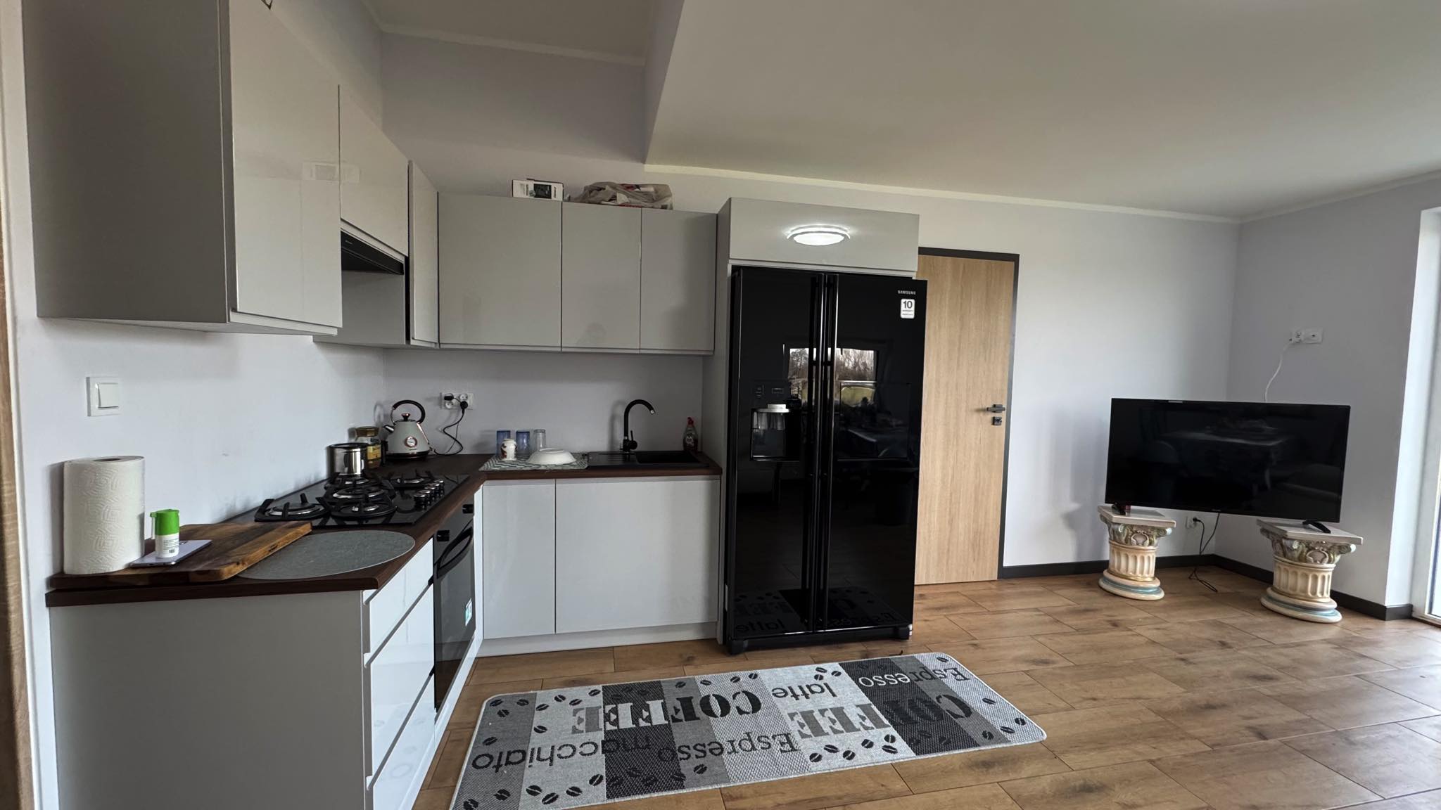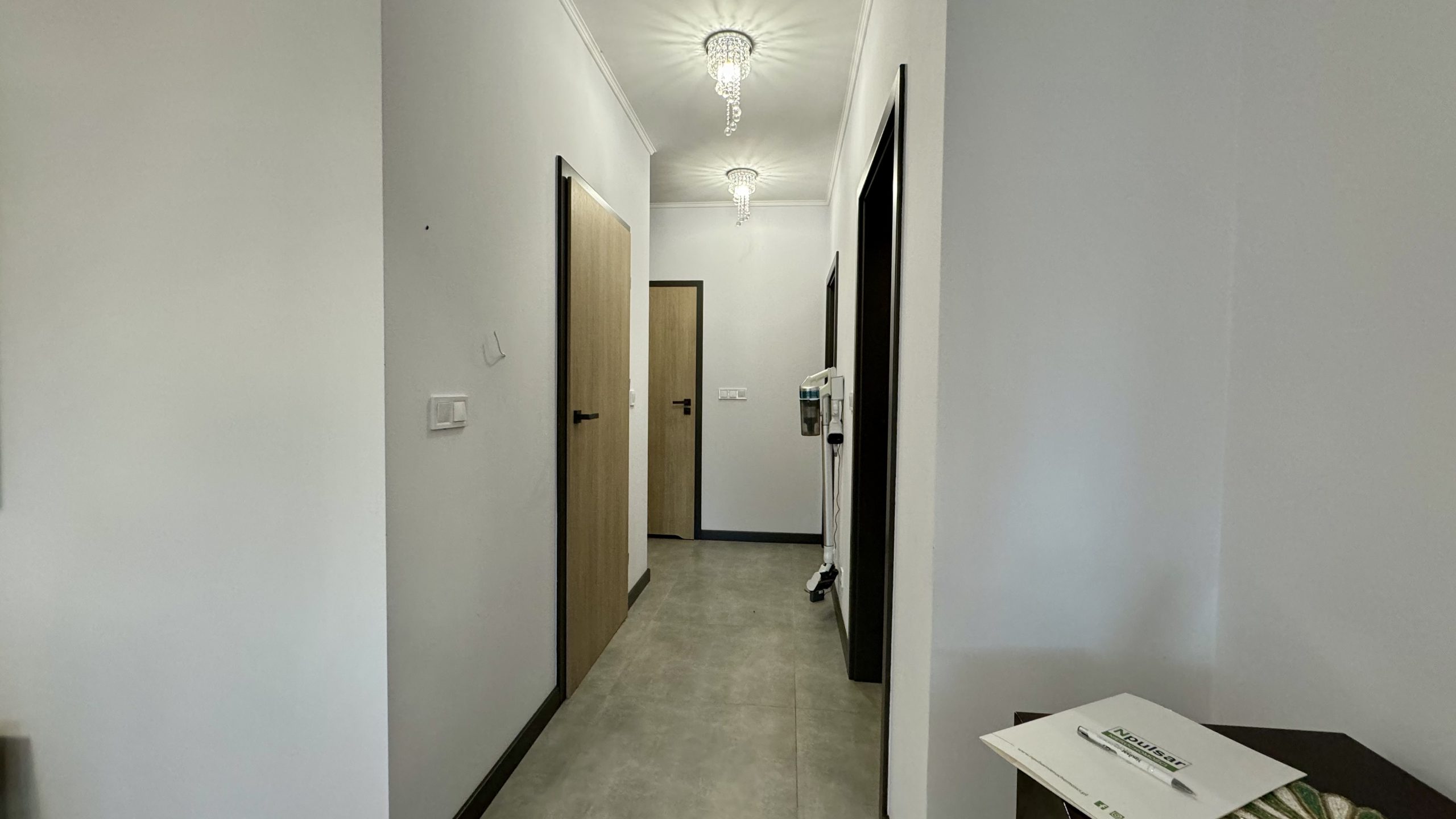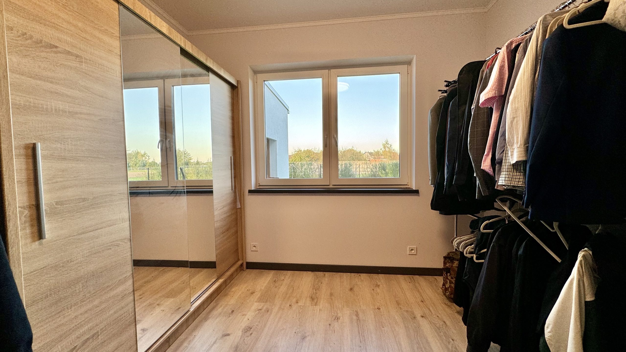 W całym budynku zamontowano ogrzewanie podłogowe zasilane powietrzną pompą ciepła. Okna wyposażono w elektrycznie sterowane rolety zewnętrzne, co dodatkowo podnosi funkcjonalność domu. Dach wielospadowy został pokryty dachówką ceramiczną, a taras oraz otoczenie budynku wykończono estetyczną kostką brukową. Działka jest w pełni ogrodzona i starannie utrzymana.