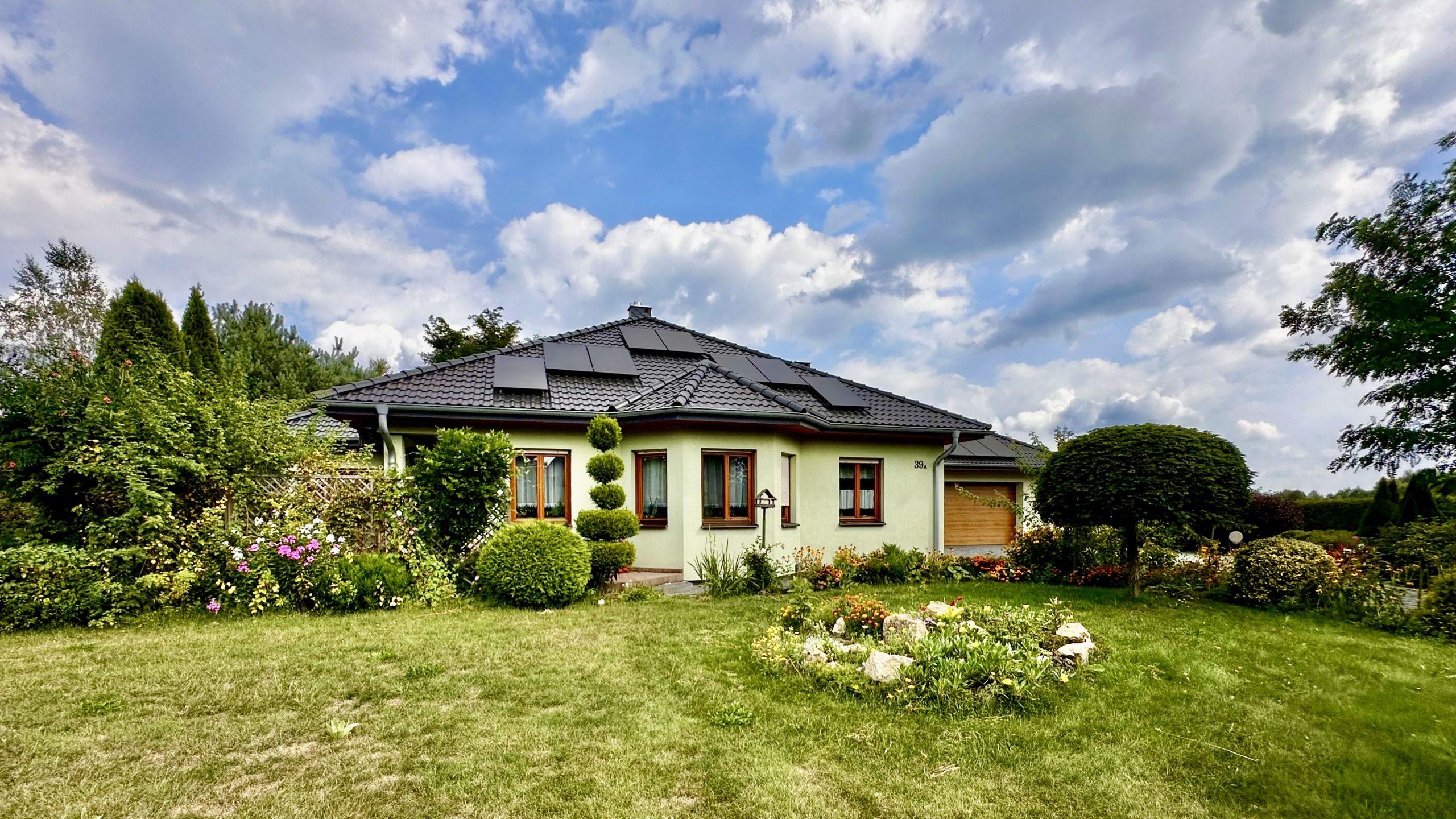 Prezentowana posiadłość, o powierzchni zabudowy 247 m², została wybudowana w 2009 roku z użyciem najlepszych materiałów – solidne ściany z pustaka ceramicznego, ocieplenie wełną mineralną oraz dach pokryty dachówką ceramiczną. Wysokiej jakości stolarka drewniana z roletami zewnętrznymi, a także eleganckie wykończenia wnętrz w ciepłych odcieniach brązu, tworzą niepowtarzalny klimat, który zadowoli nawet najbardziej wysublimowane gusta.