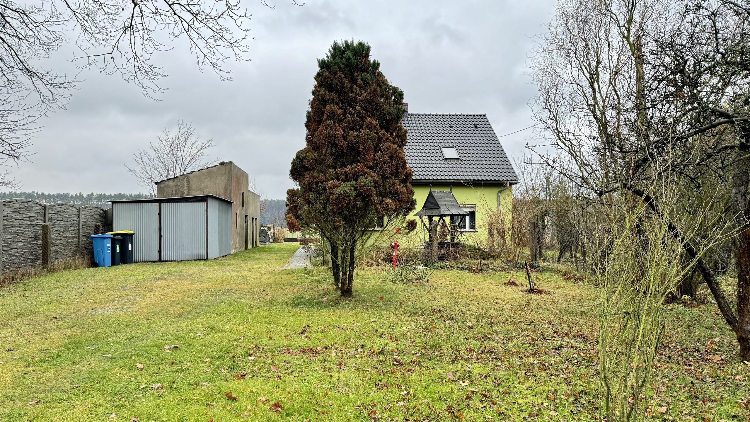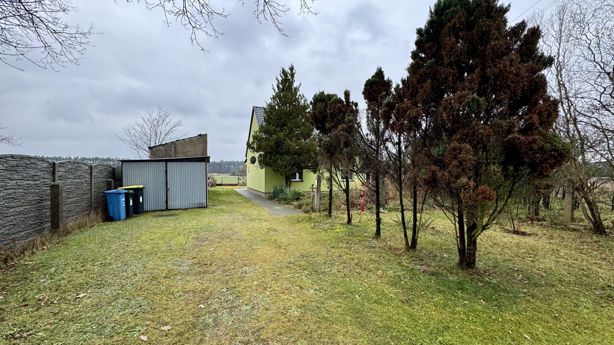 - Na podwórku znajdują się dodatkowe zabudowania gospodarcze oraz blaszany garaż.