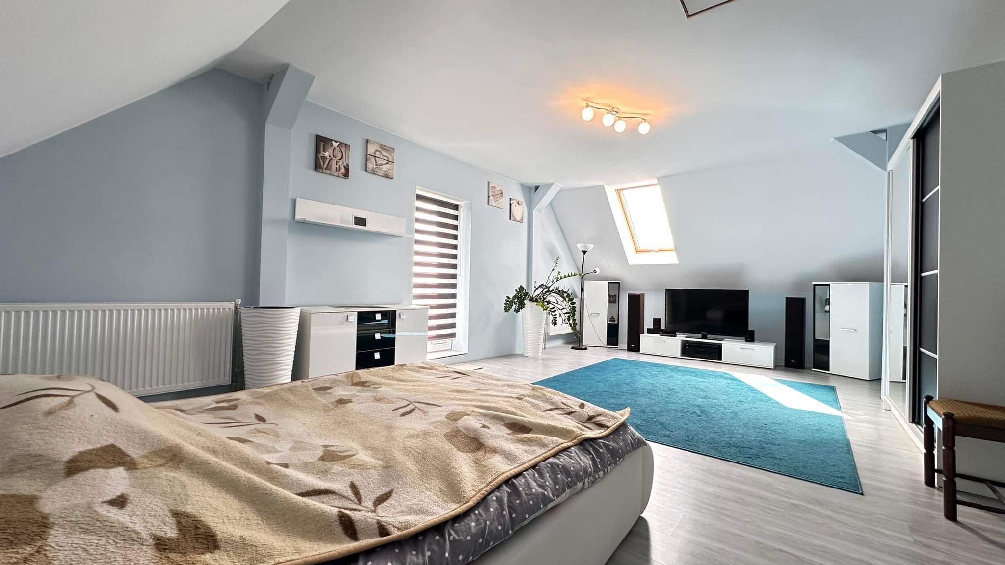 - Duża sypialnia na całej szerokości domu z wyjściem na balkon