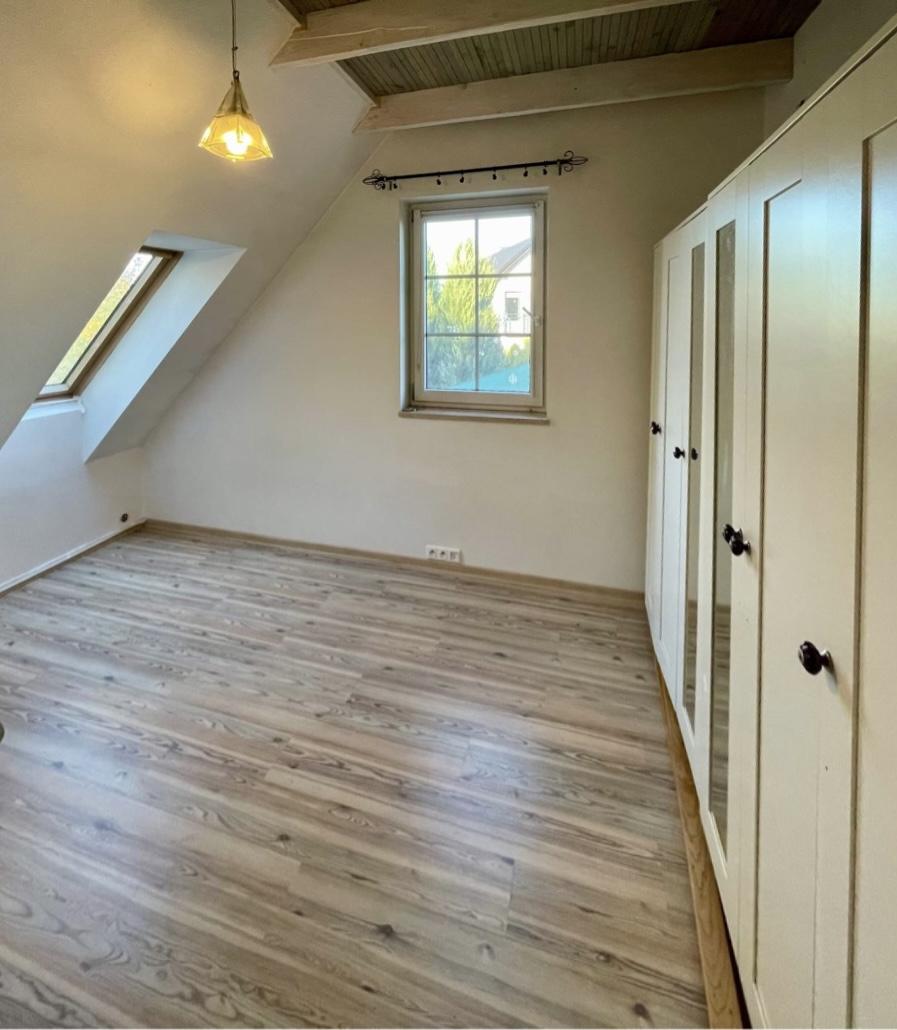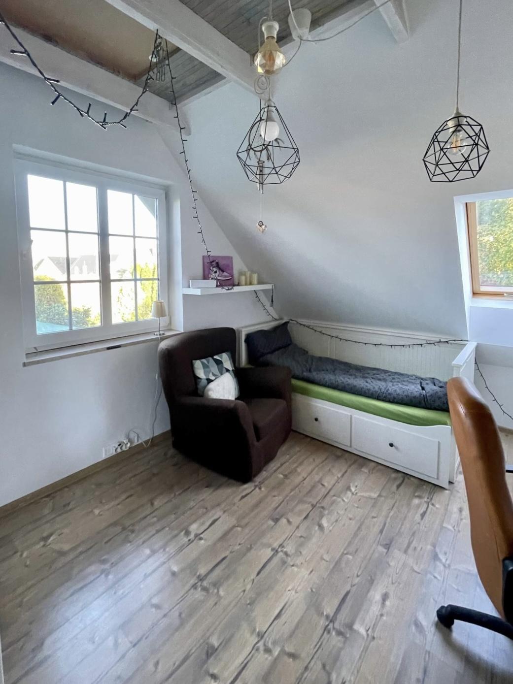 2 jasne, ustawne sypialnie z oknami szczytowymi i dachowymi, z dostępem do estetycznie wykończonego stryszka, który może służyć jako dodatkowa przestrzeń do zabaw dla dzieci