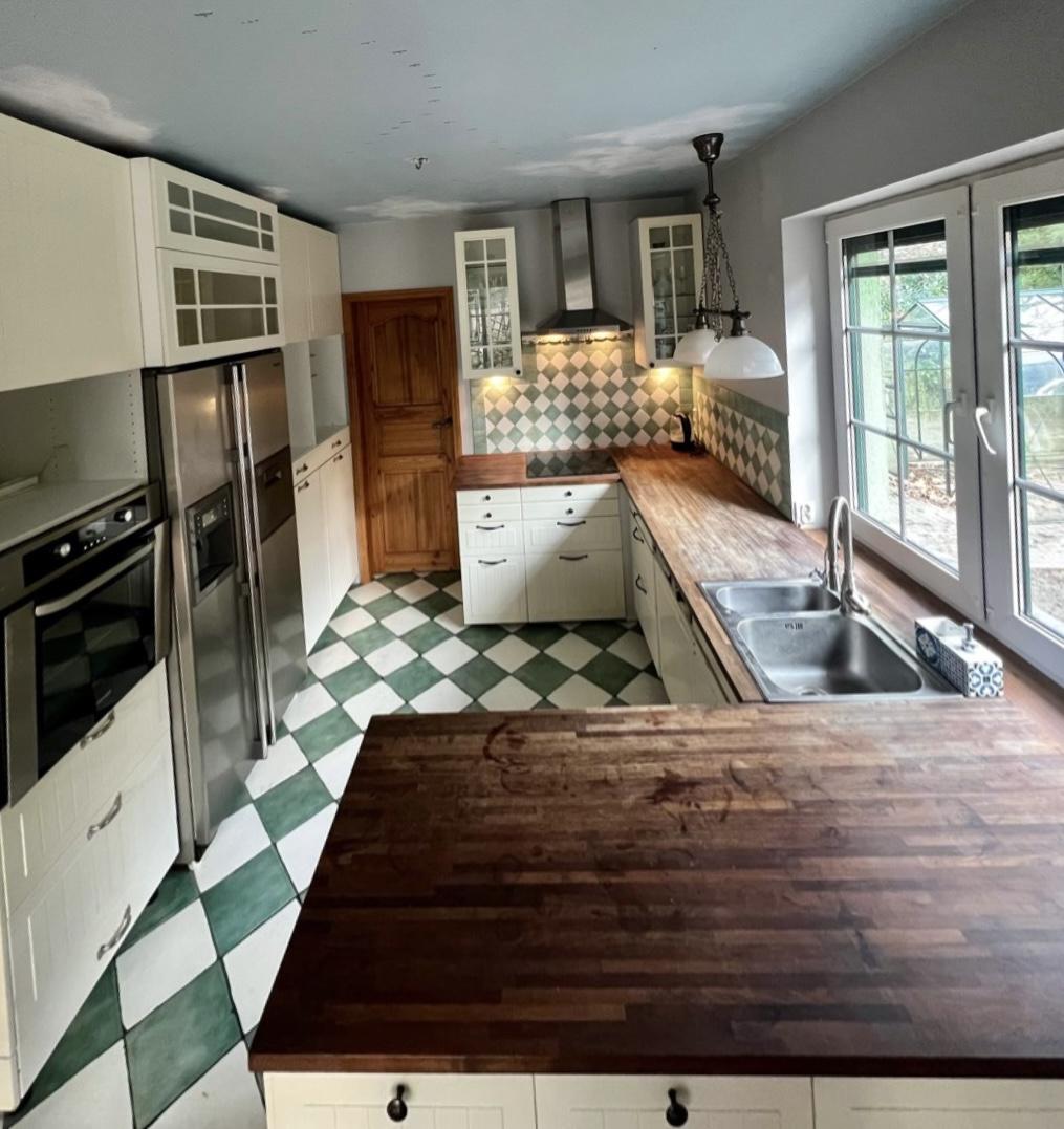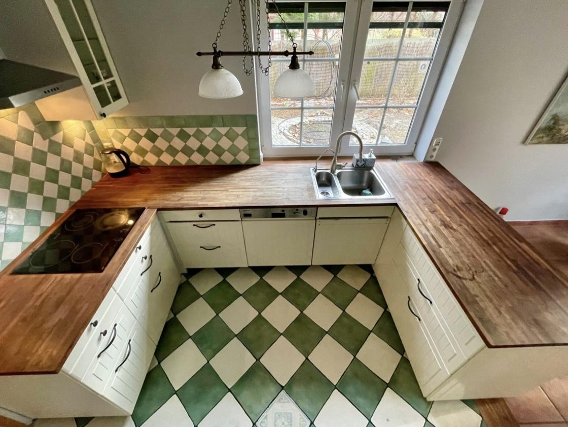 Otwarta kuchnia z blatem w kształcie litery „U” i wyjściem do ogrodu ziołowego