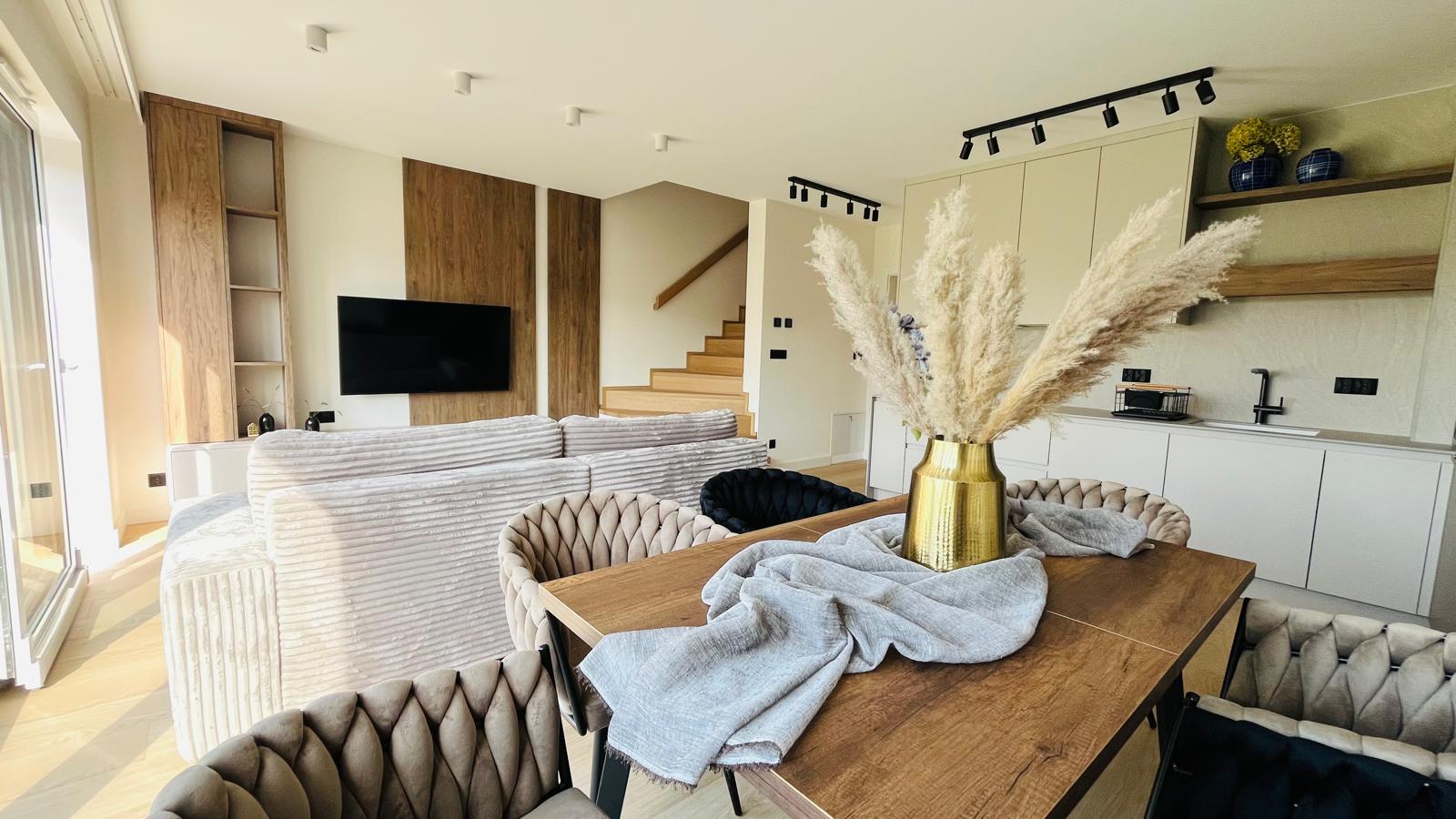 - Przestronny salon z aneksem kuchennym i wyjściem na taras