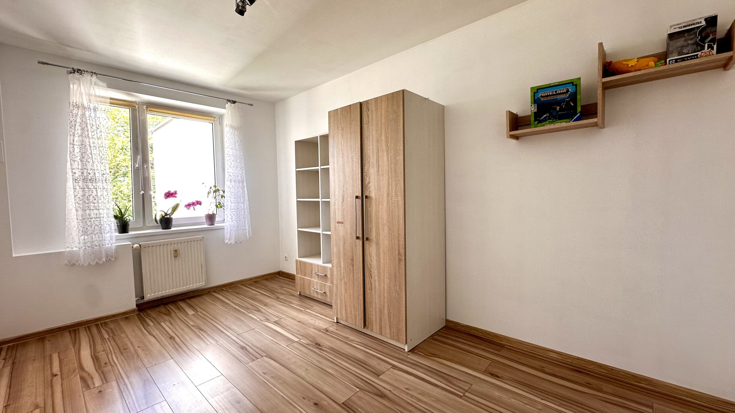 - okna PCV, na podłogach panele i gres,