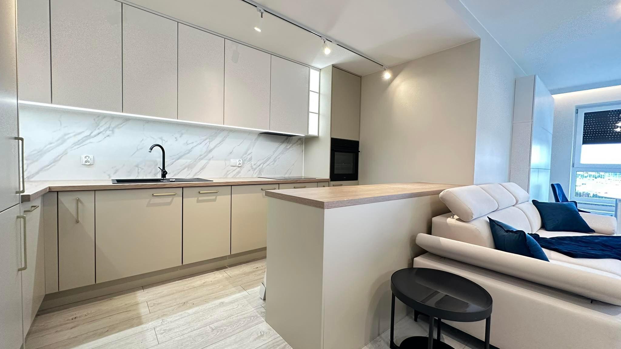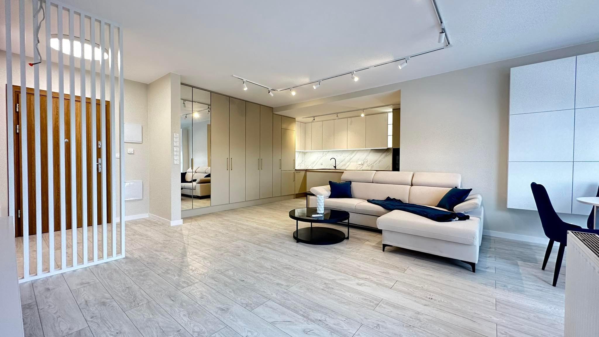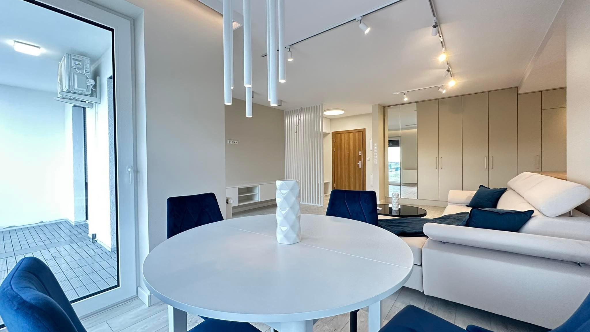 Salon wyposażony jest w narożnik z funkcją spania, stół z 4 krzesłami, szafy w zabudowie oraz szafkę rtv. W kuchni znajdują się meble na wymiar oraz niezbędne sprzęty AGD tj. zmywarka, piekarnik, płyta indukcyjna i lodówka. Sypialnia wyposażona jest w duże i wygodne łóżko oraz szafę. Wnętrze jasne, przestrzenne, urządzone z dbałością o każdy szczegół. Do mieszkania przynależy miejsce postojowe w garażu podziemnym za dodatkową opłatą 270zł. Czynsz około 550 zł + prąd. Kaucja zwrotna 5000 złotych.