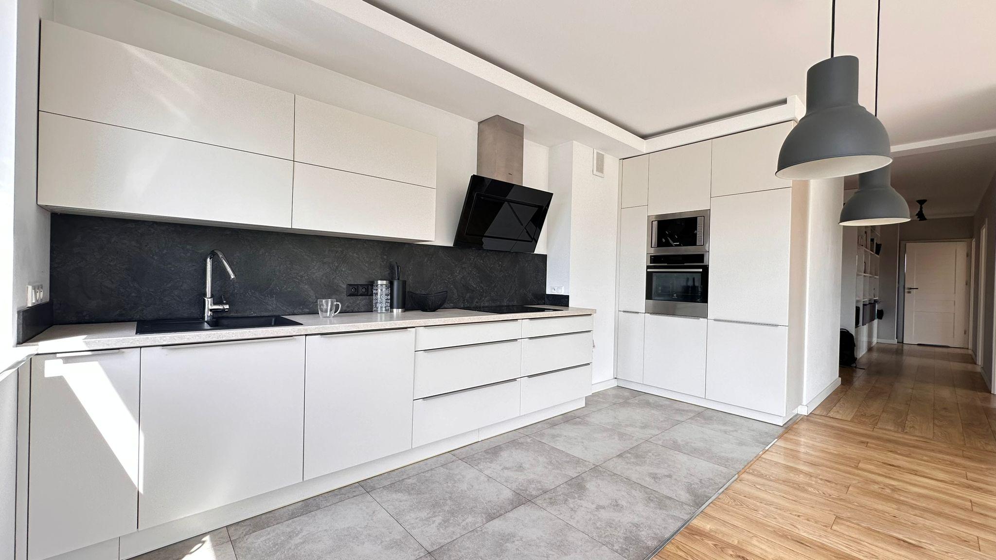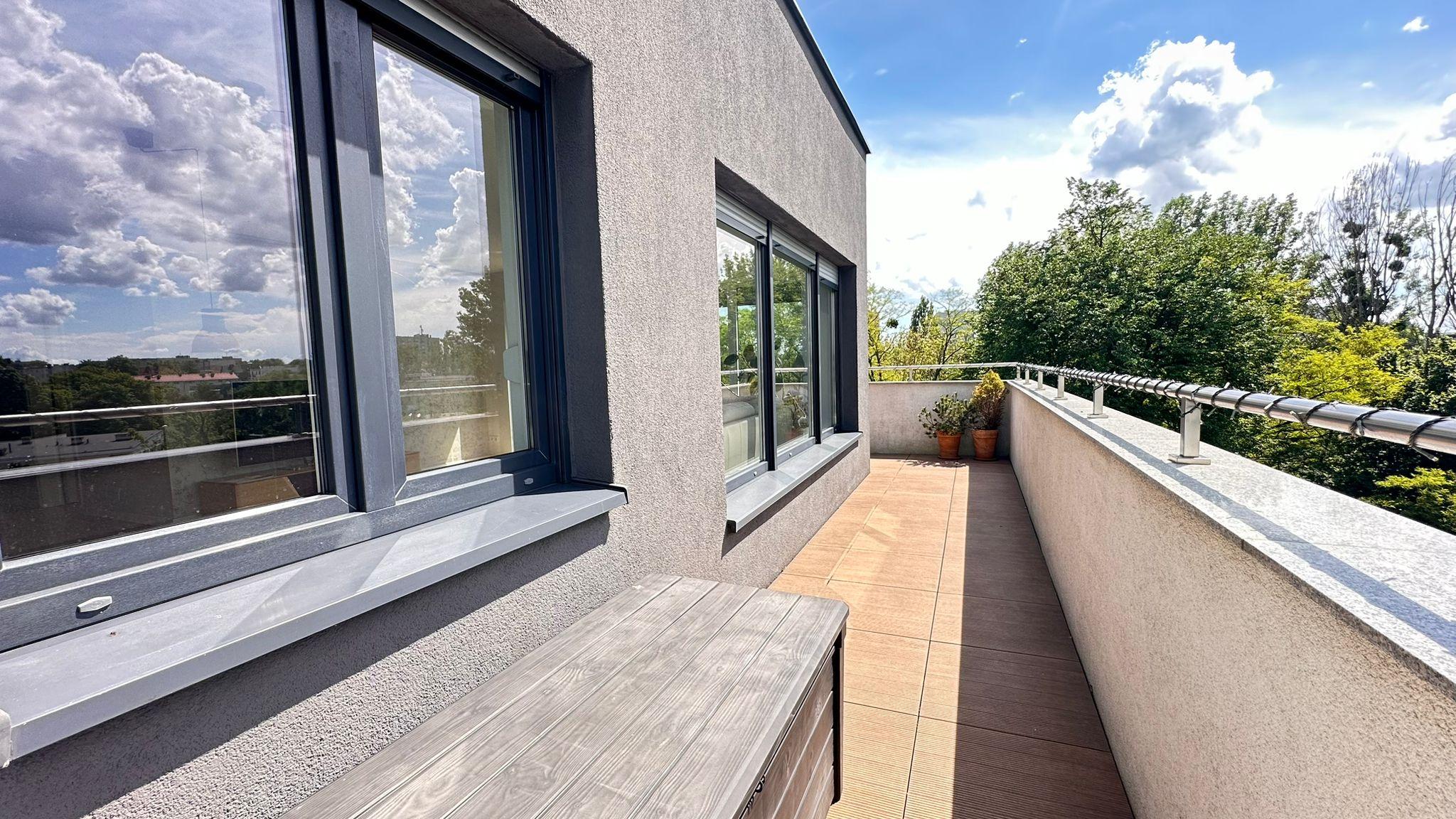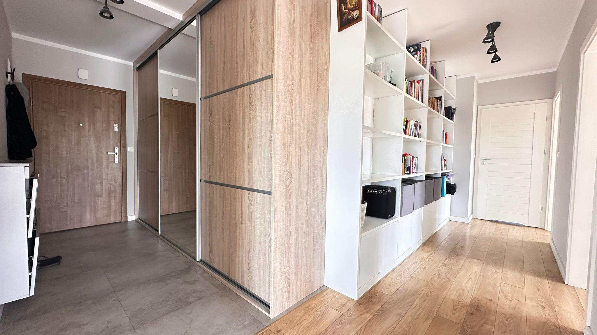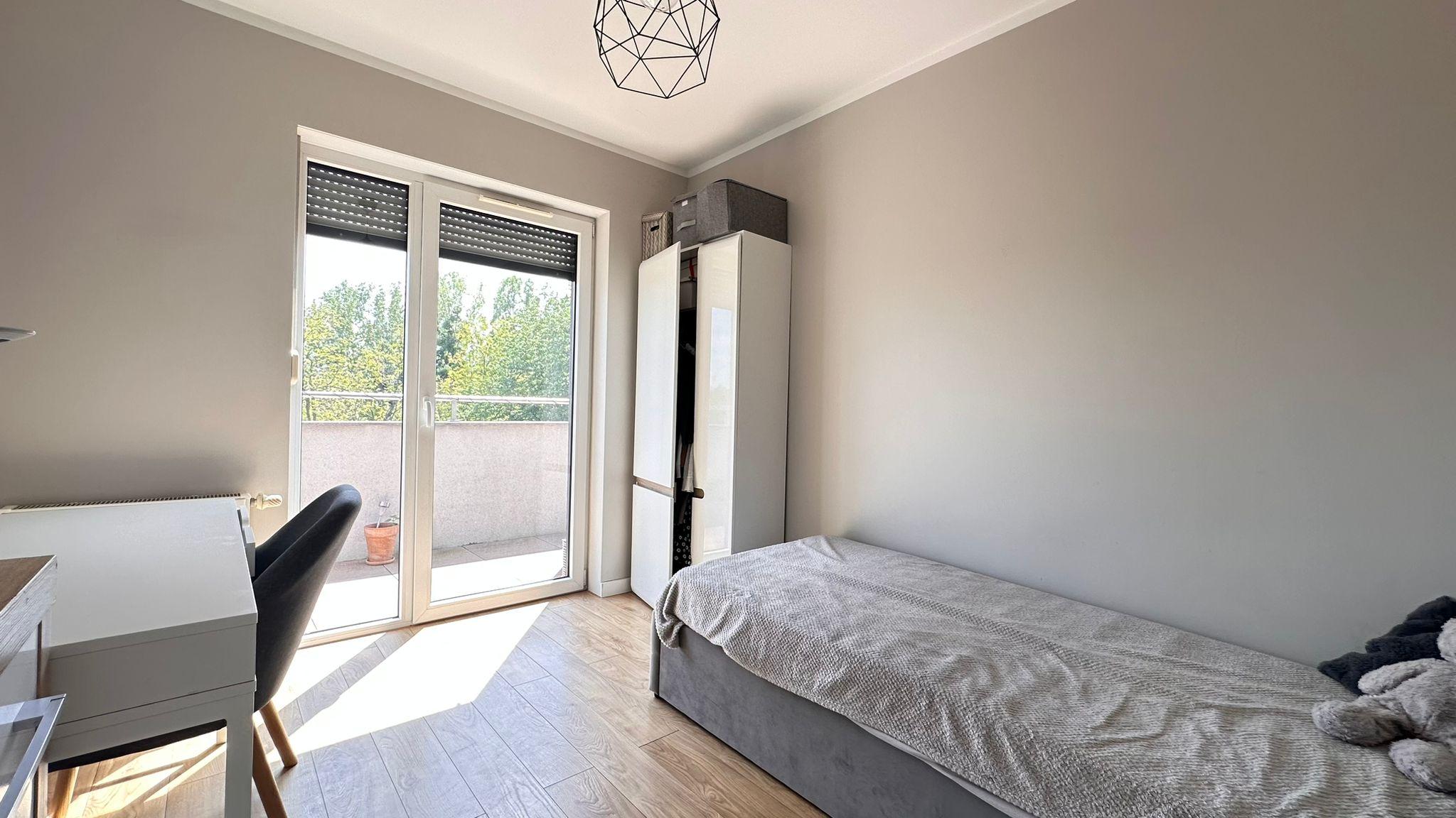 Mieszkanie składa się z przestronnego salonu z aneksem kuchennym i dużymi przeszkleniami, trzech oddzielnych pokoi, łazienki z wc, osobnego wc z miejscem na pralkę oraz dużego przedpokoju. Z każdego pokoju i salonu prowadzi wyjście na duży taras (35,70 m²) z pięknym widokiem na tereny zielone.