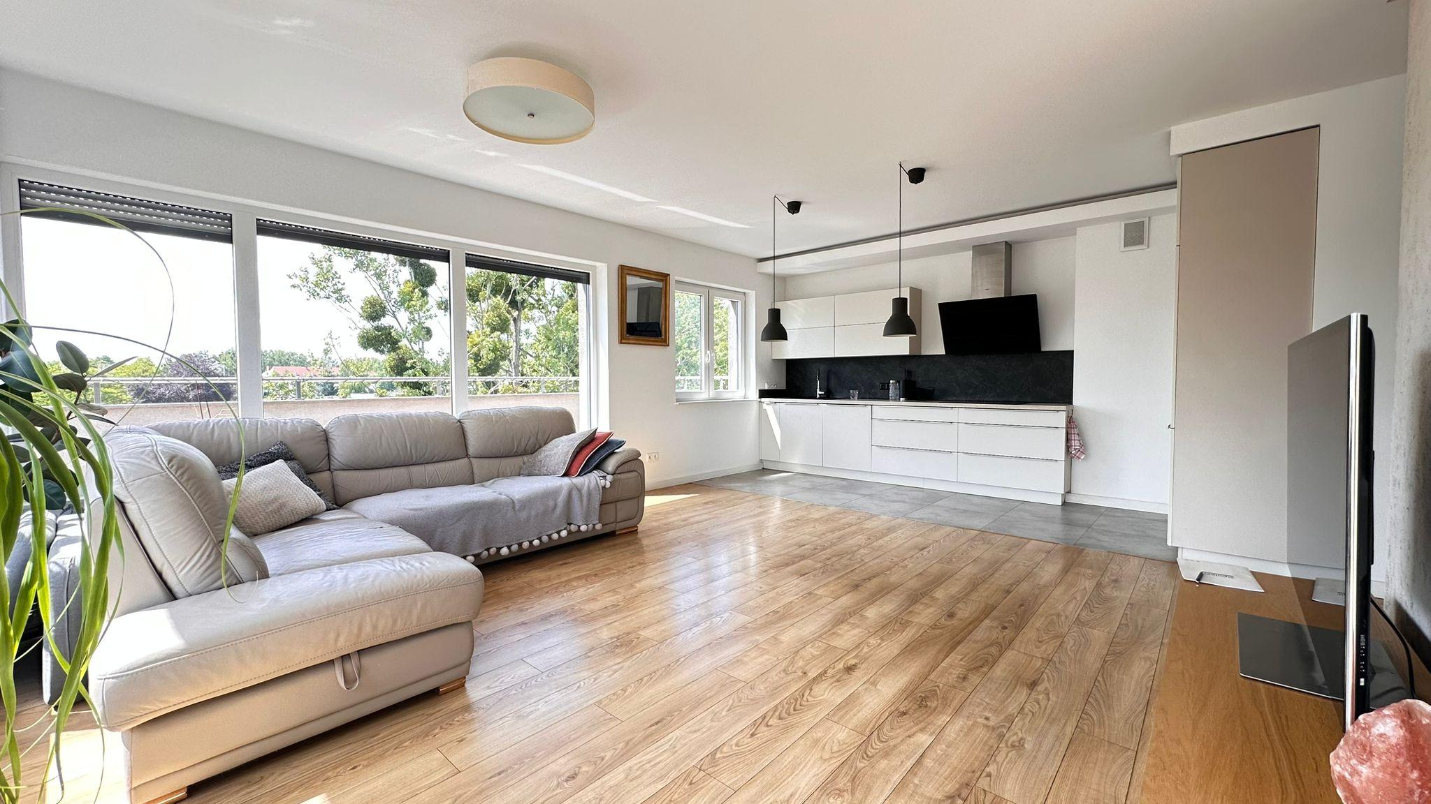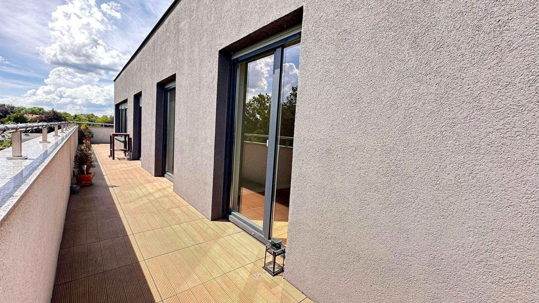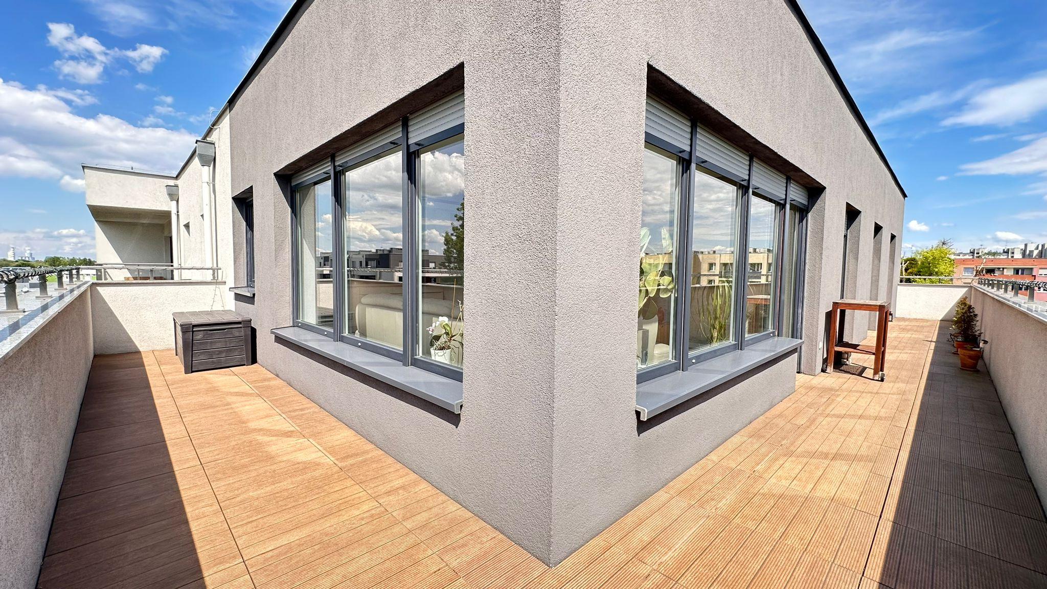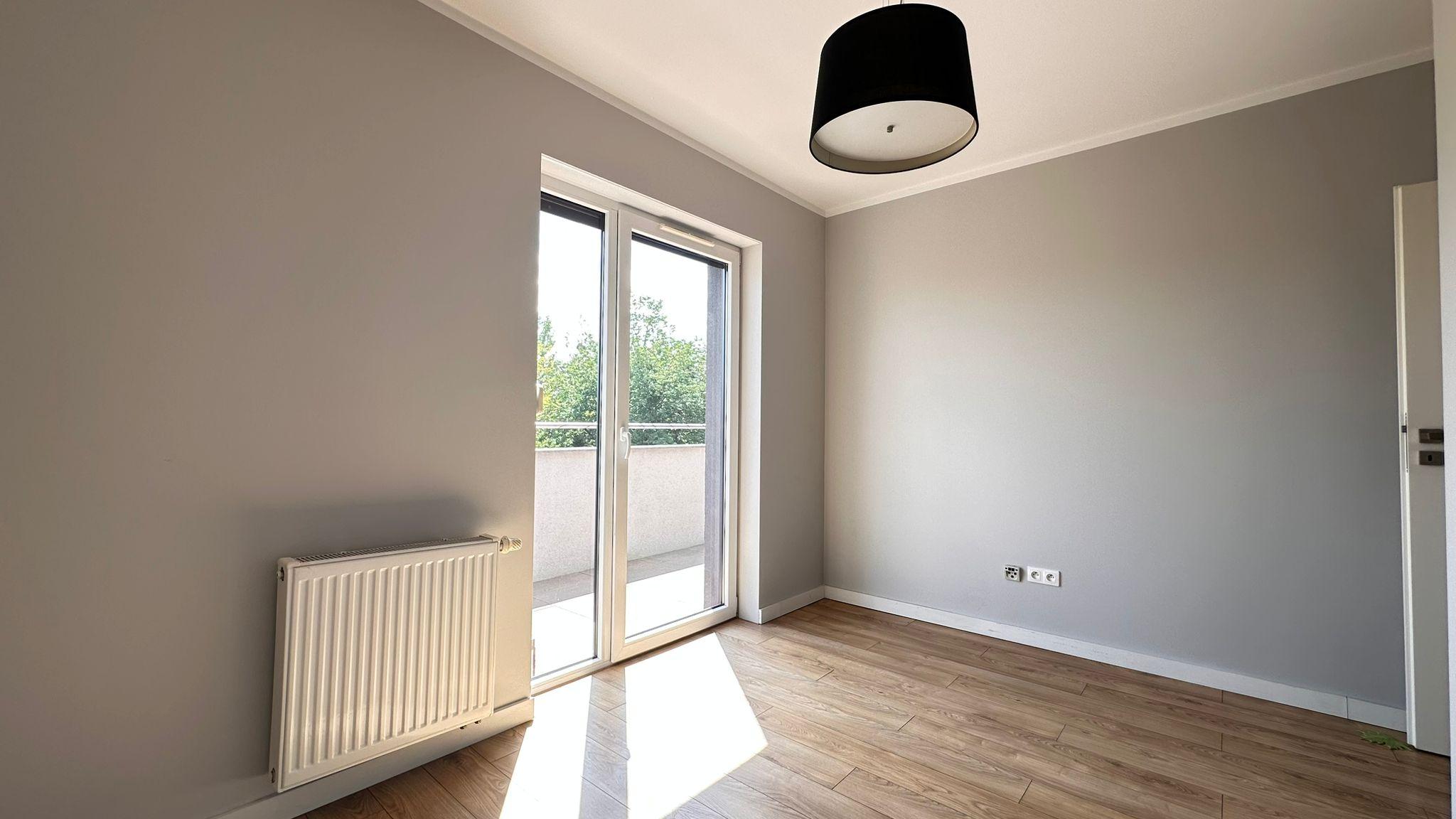 Mieszkanie składa się z przestronnego salonu z aneksem kuchennym i dużymi przeszkleniami, trzech oddzielnych pokoi, łazienki z wc, osobnego wc z miejscem na pralkę oraz dużego przedpokoju. Z każdego pokoju i salonu prowadzi wyjście na duży taras (35,70 m²) z pięknym widokiem na tereny zielone.