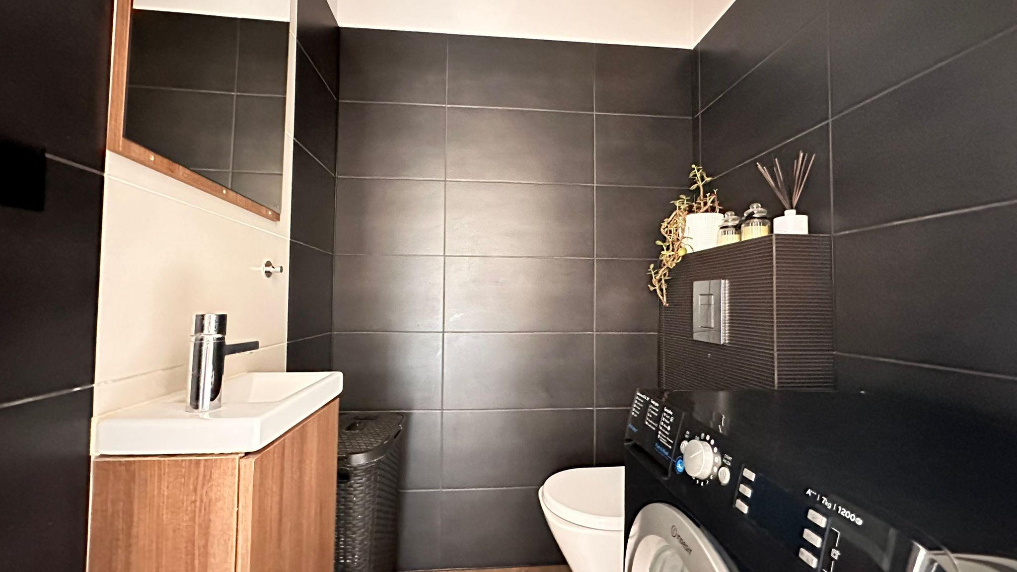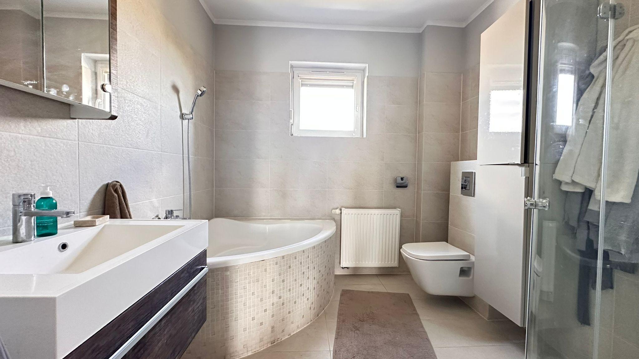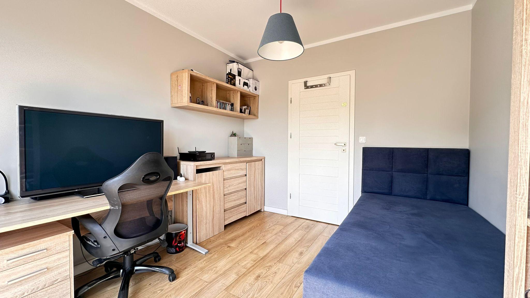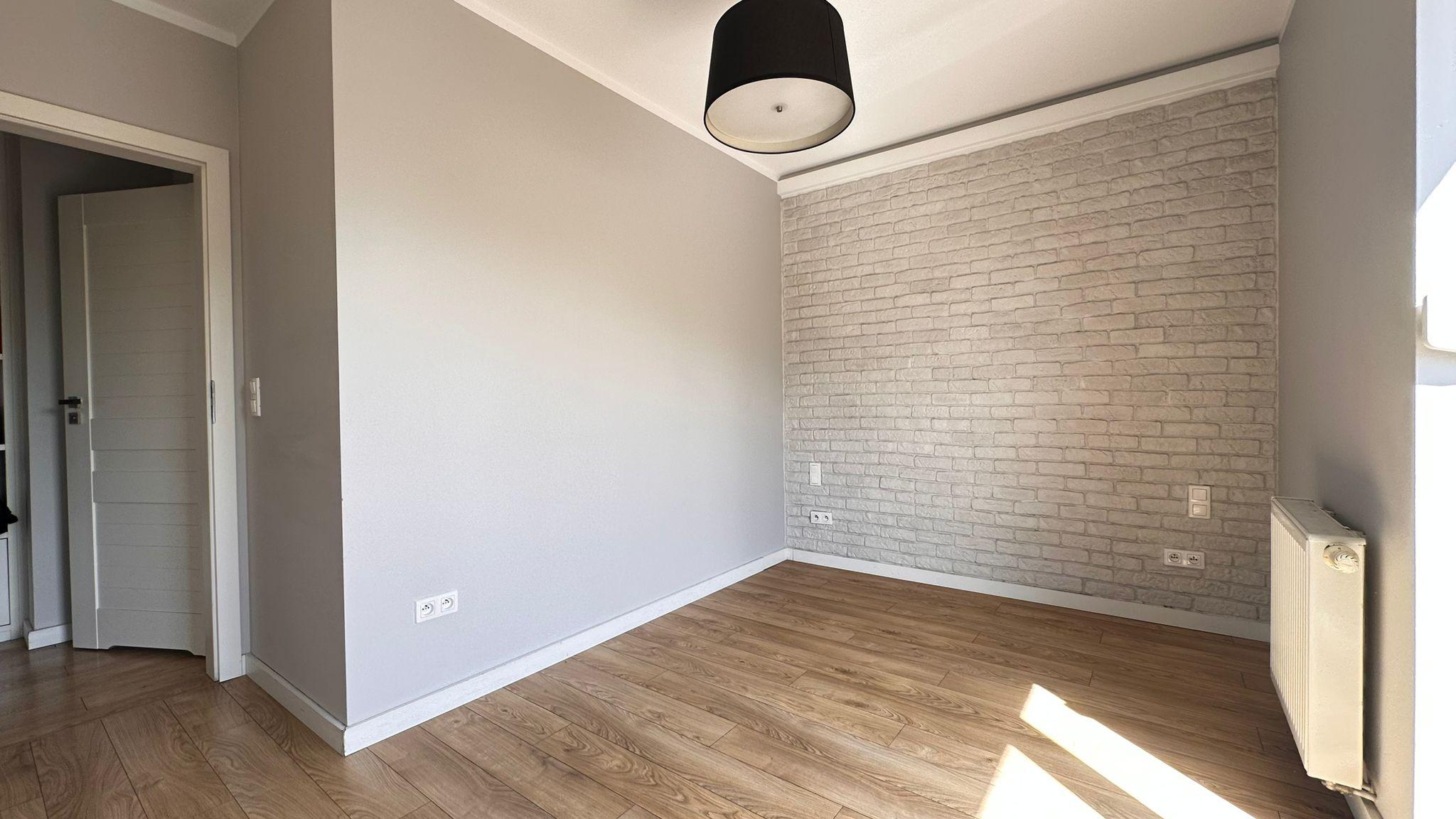 Wnętrze wykończone jest panelami i kaflami, ściany gładzone i ozdobione tynkiem strukturalnym. Nowoczesna kuchnia na wymiar wyposażona jest w sprzęty AGD: płyta i piekarnik Electrolux, zmywarka AEG, okap Amica, lodówko-zamrażarka Electrolux, mikrofalówka Samsung. W przedpokoju znajduje się duża szafa z częścią gospodarczą i licznymi półkami. Łazienka jest wykafelkowana, z wanną, prysznicem, wc, umywalką i szafkami.