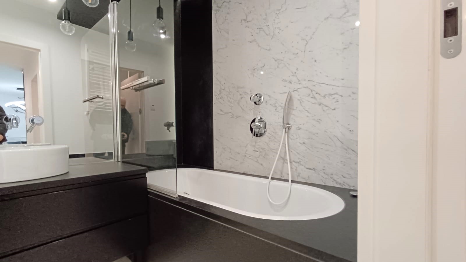 - Łazienka z WC – luksusowo wykończona w granicie i marmurze, z armaturą Cludi i ceramiką Roca,