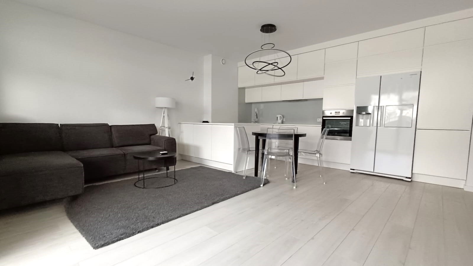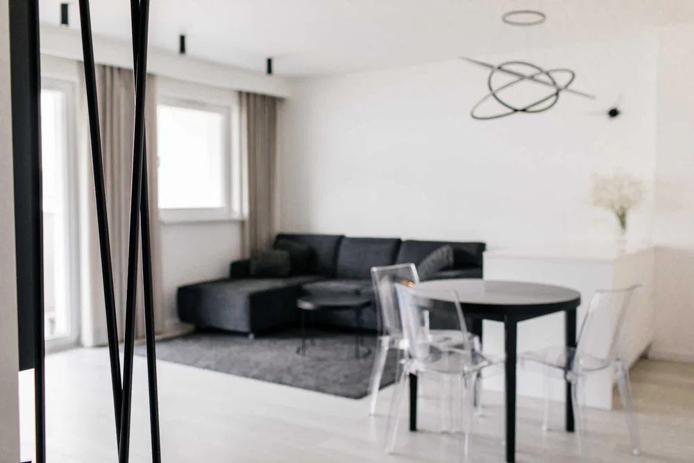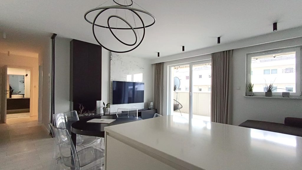 - Salon z aneksem kuchennym – przestronny, jasny, wyposażony w wysokiej klasy meble i sprzęt, z oknami od podłogi do sufitu,