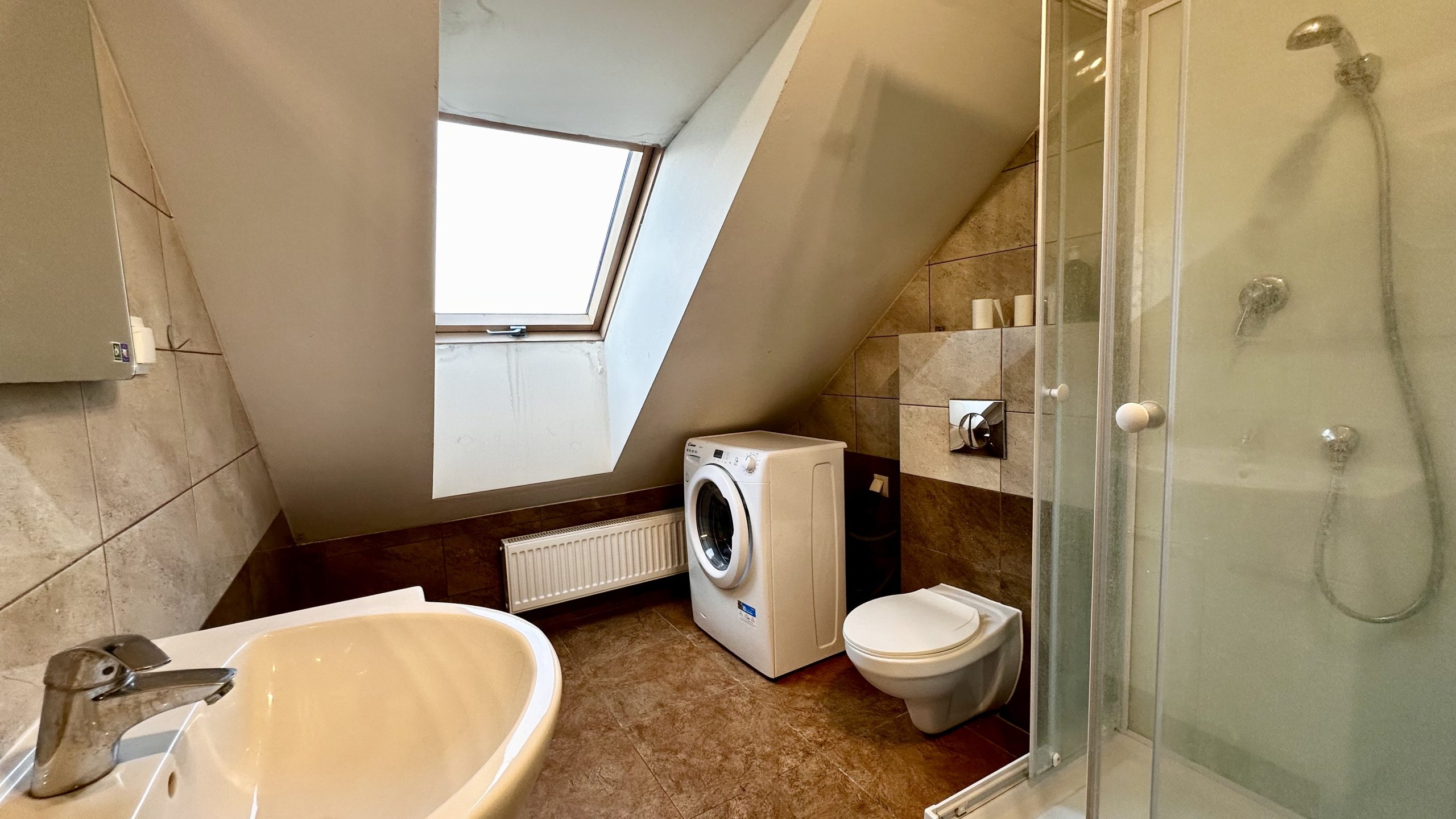 Łazienka – wyposażona w prysznic oraz pralkę.