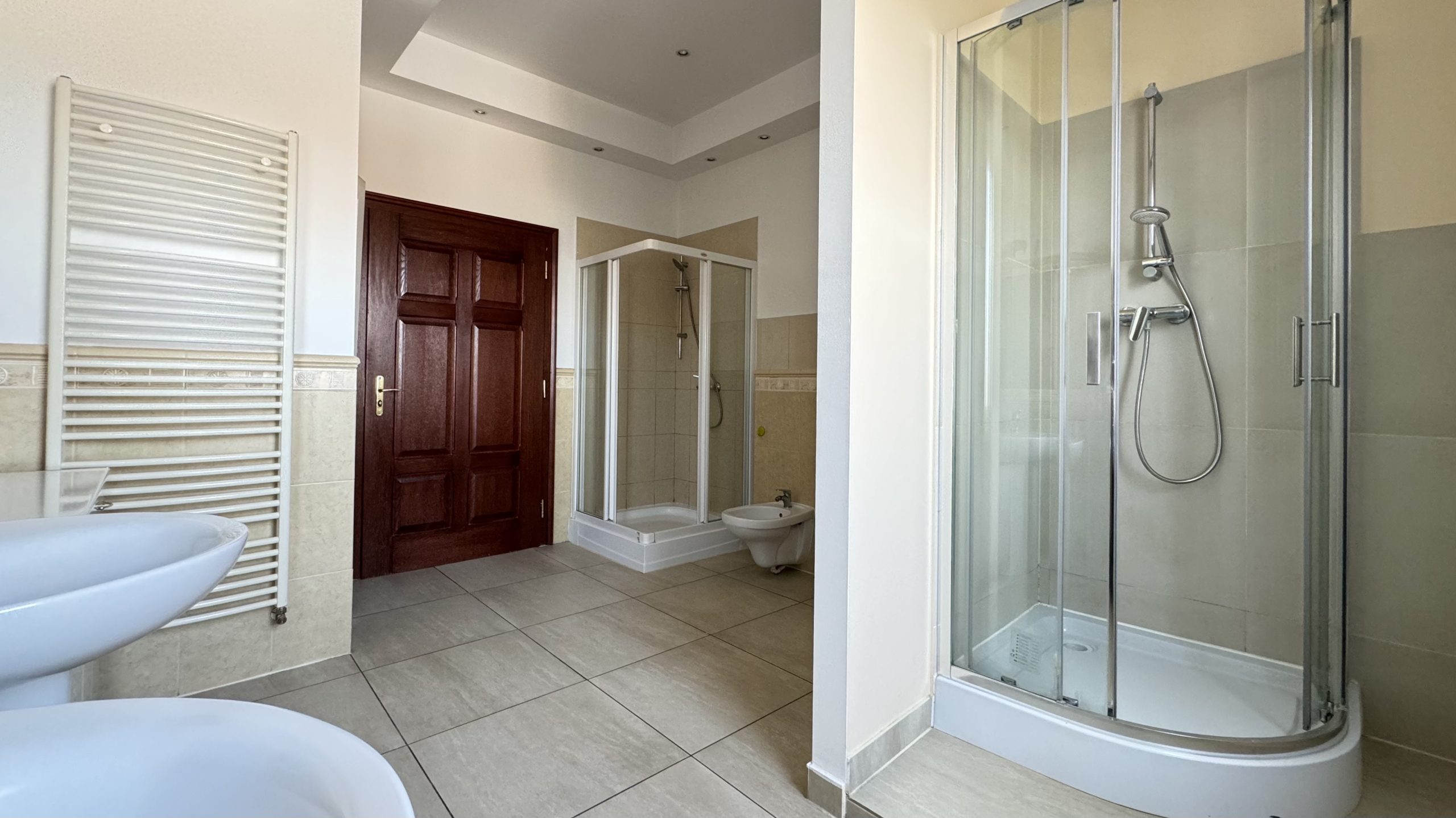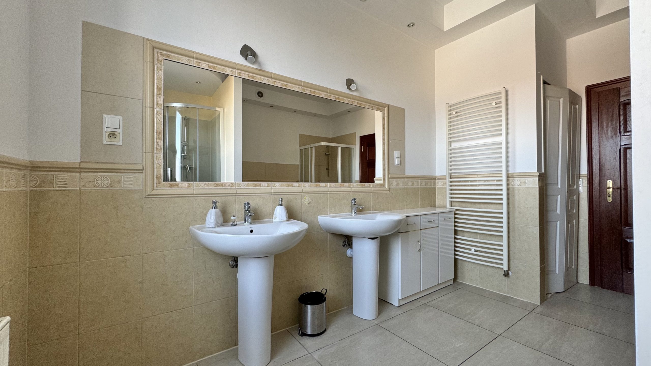 - bardzo dużej łazienki, która pełni funkcję pokoju kąpielowego – znajdują się w niej dwie umywalki, dwa prysznice, bidet oraz toaleta,