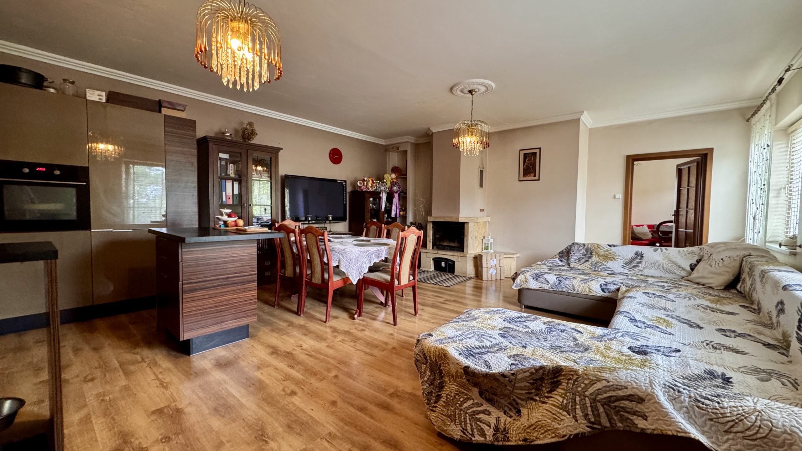 - Salon z aneksem kuchennym i kominkiem