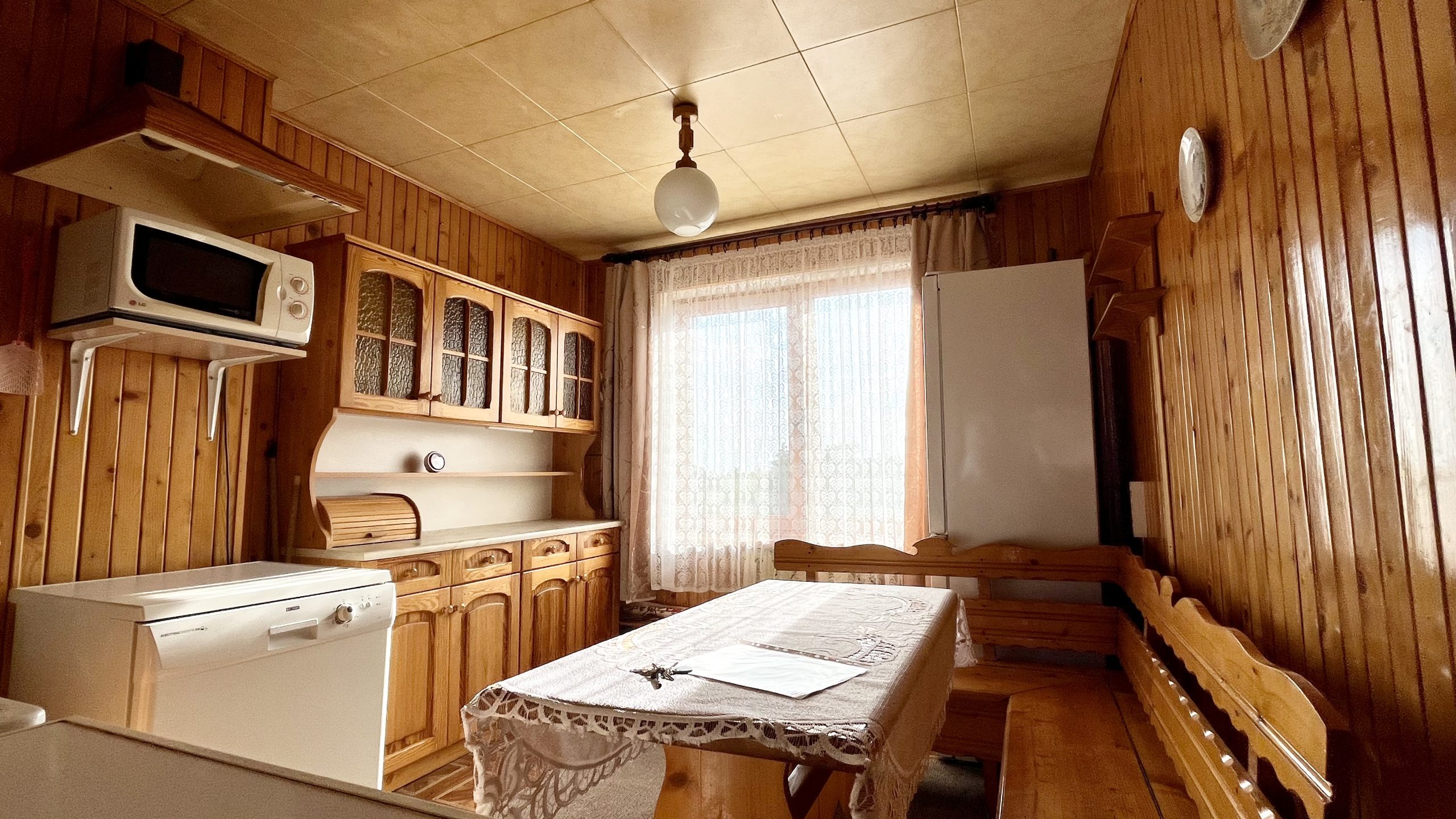 - Kuchnia: osobna, z oknem, umeblowana (zmywarka, kuchenka gazowa, pralka)