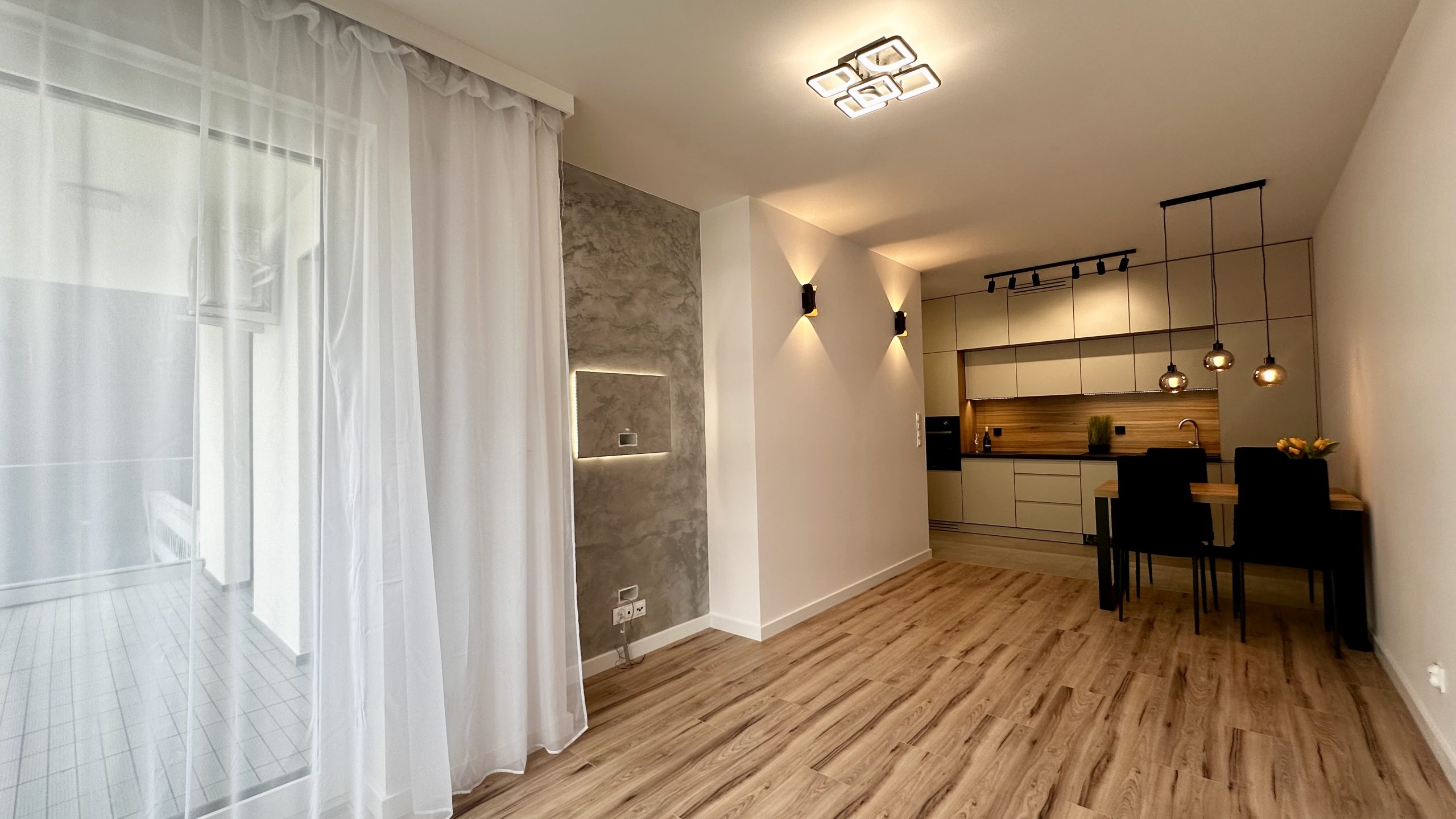 – Salon z aneksem kuchennym – przestronny i jasny, z nowoczesną kuchnią w zabudowie, wyposażoną w pełen zestaw AGD: płytę indukcyjną, piekarnik, lodówkę oraz zmywarkę. Na podłodze panele oraz eleganckie kafelki.