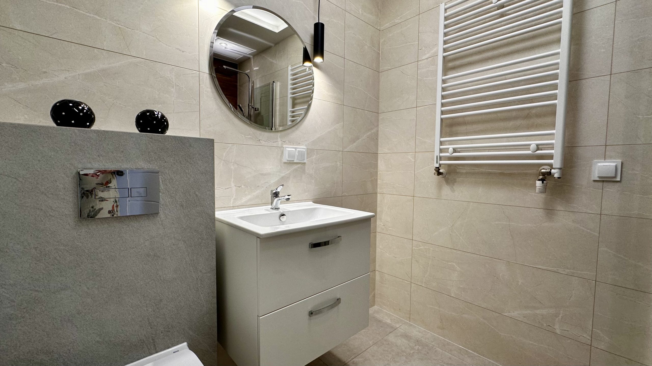 – Łazienka z WC – wykończona w nowoczesnym stylu, z prysznicem, umywalką z szafką i dużym lustrem.