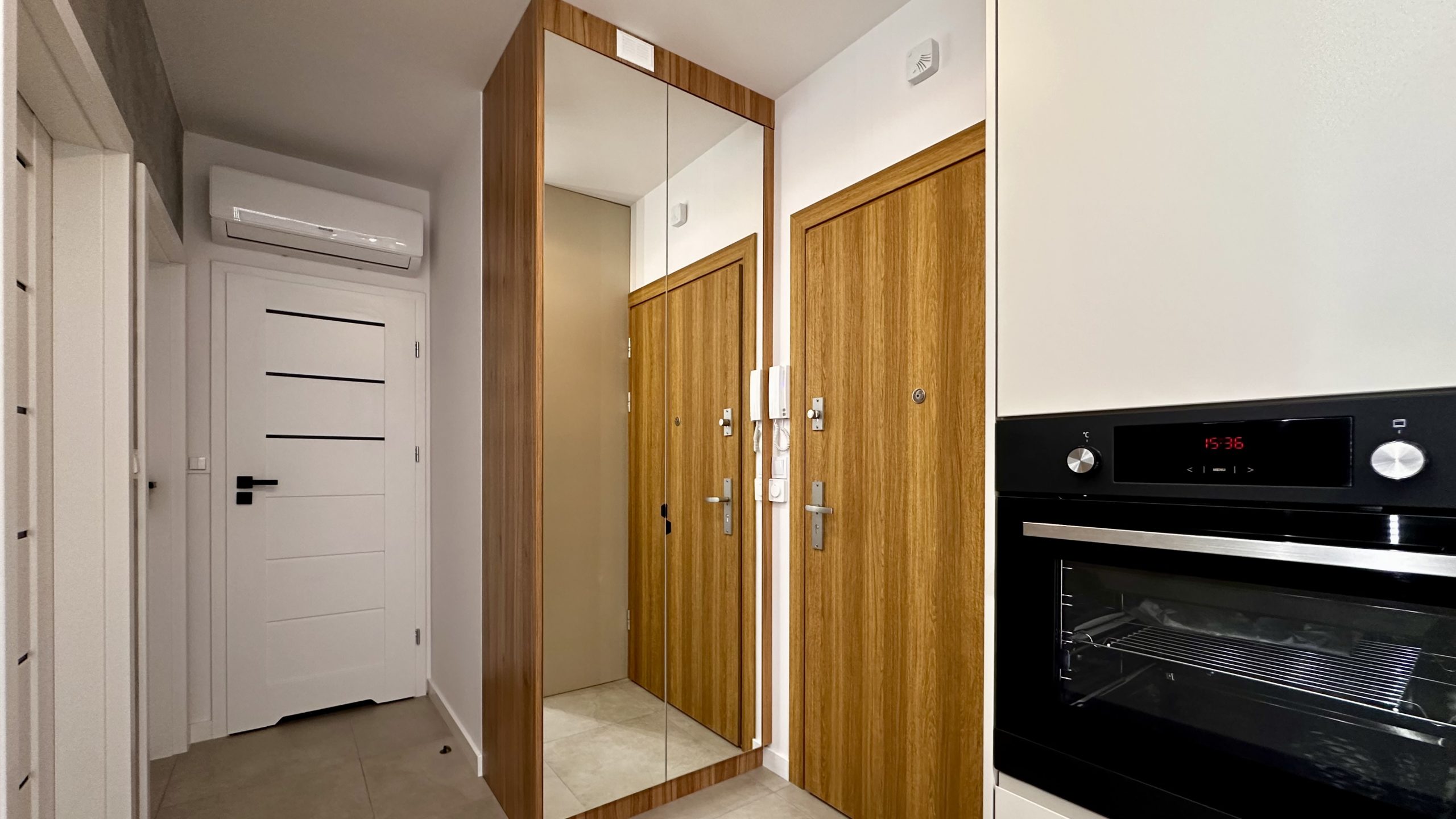 – Przedpokój – z dużą szafą z lustrem w zabudowie oraz klimatyzacją nad wejściem do łazienki.