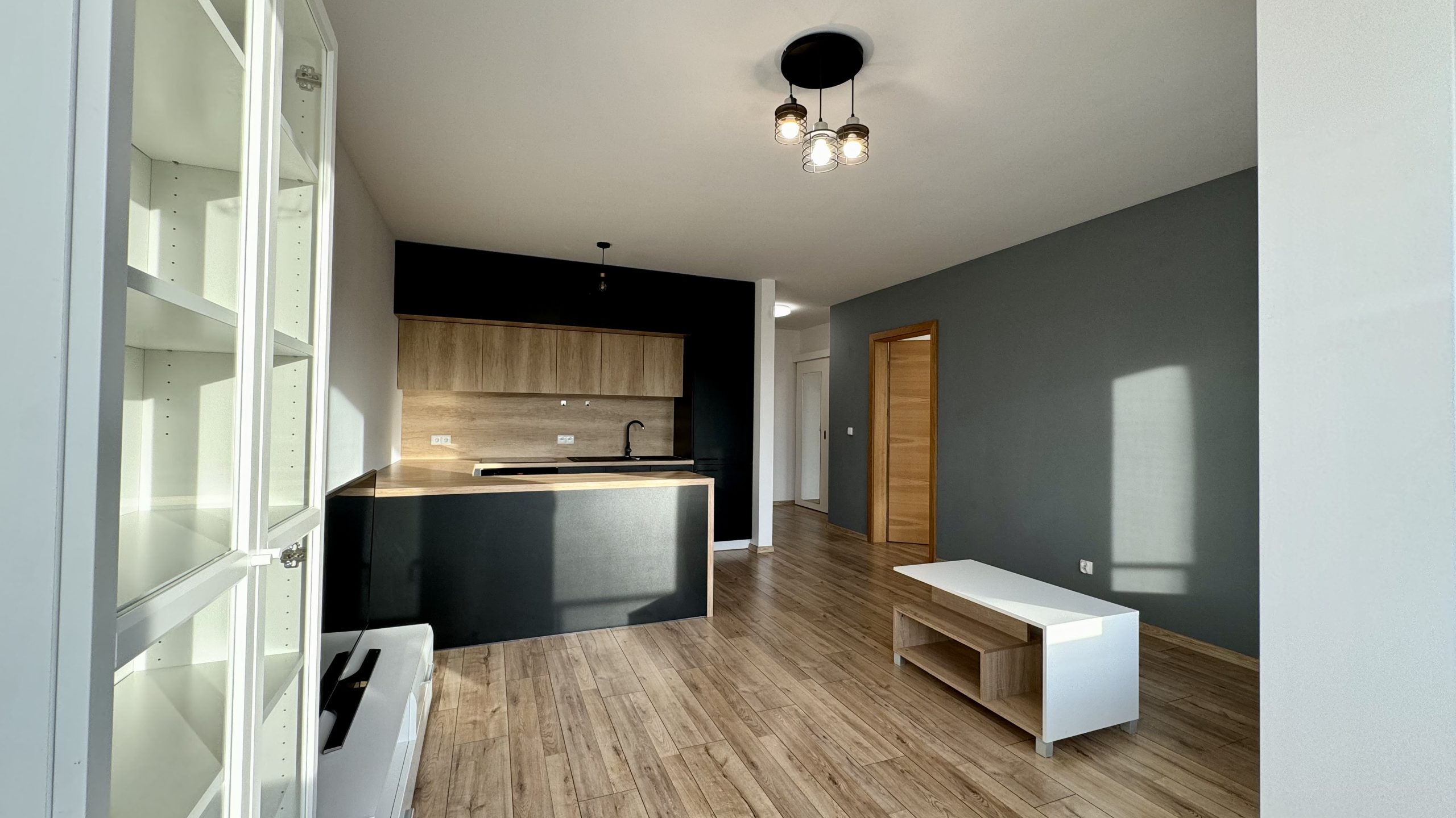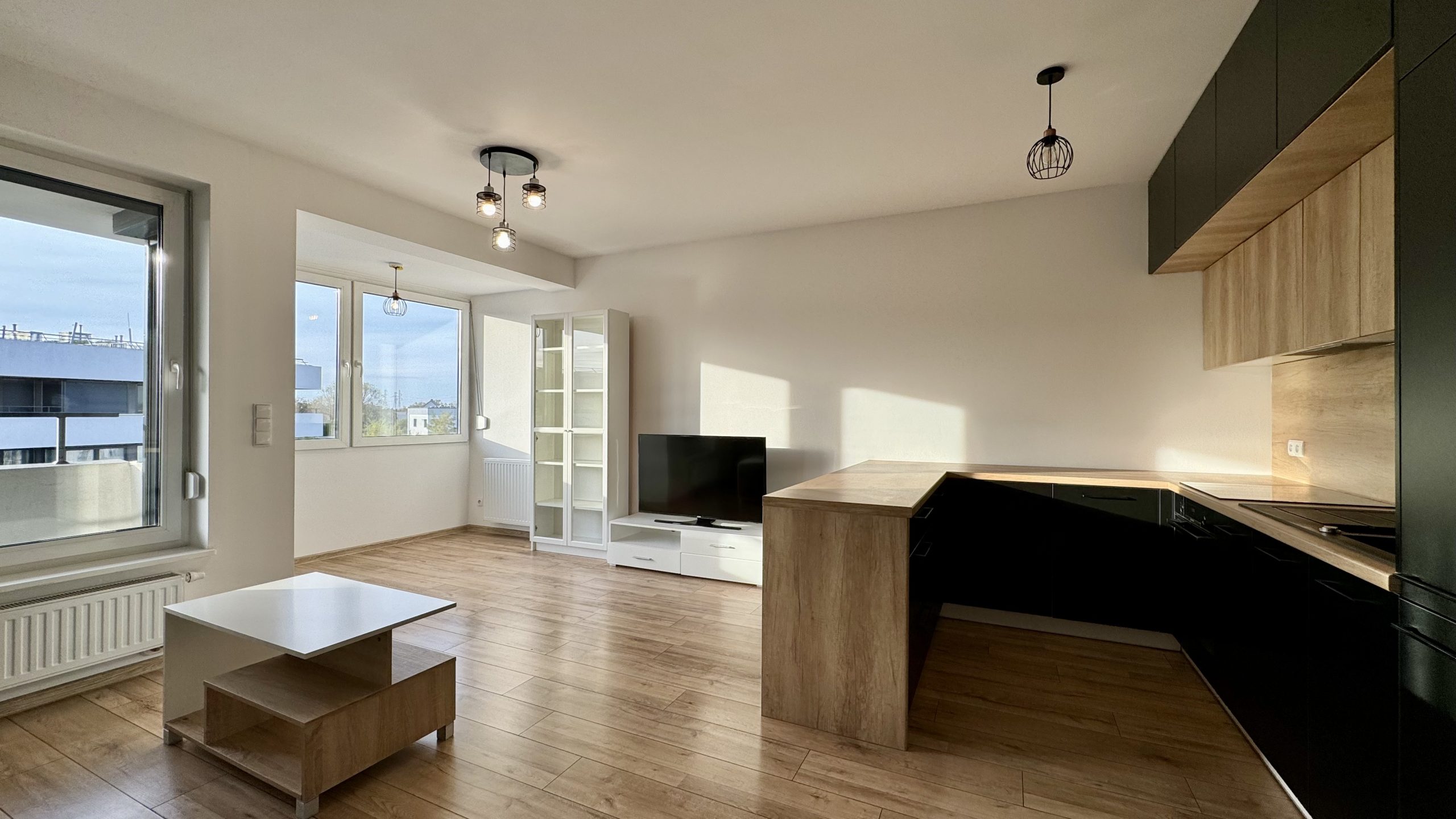 - • Jasny salon połączony z nowoczesnym aneksem kuchennym.