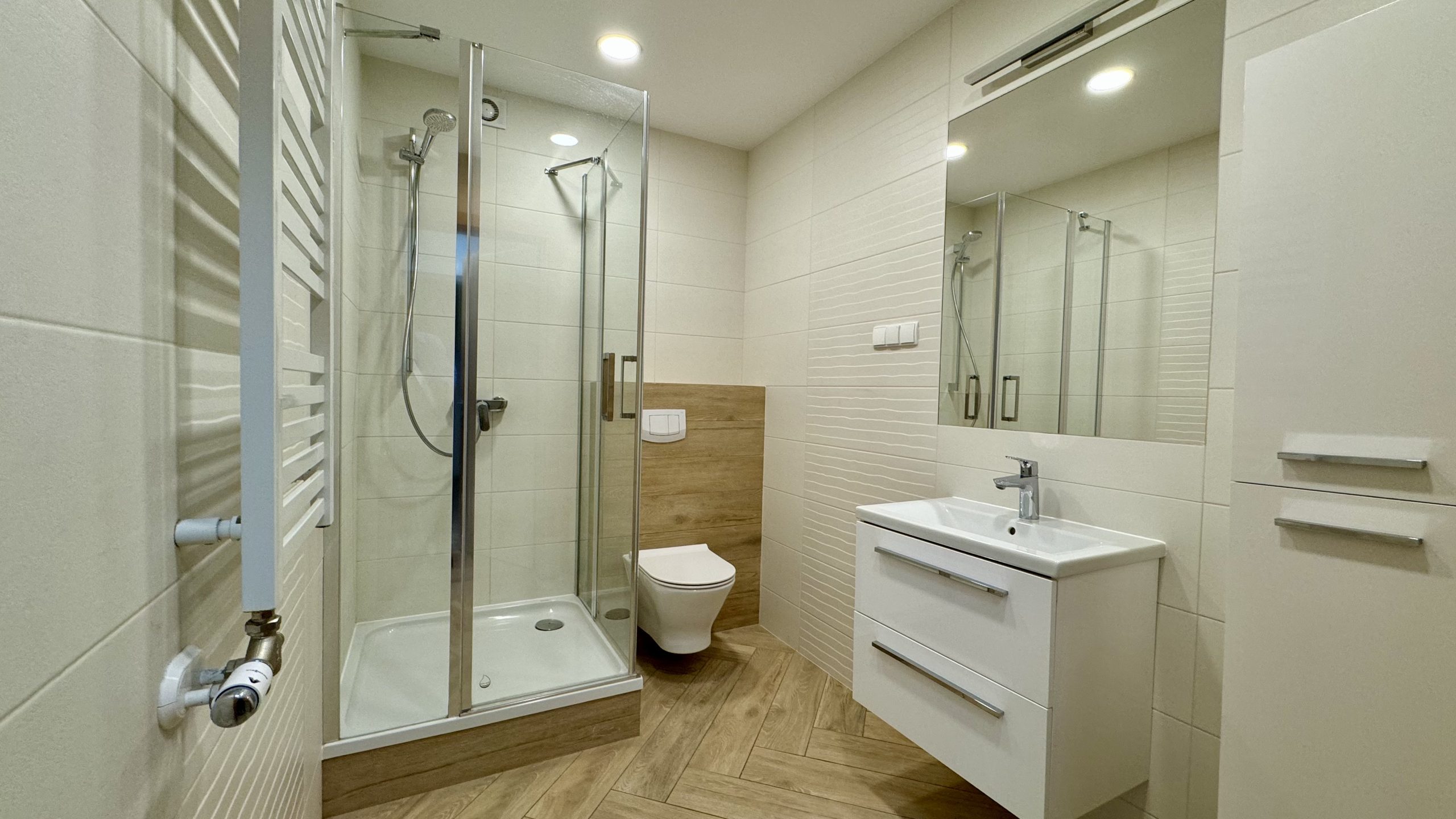 - • Nowoczesna kuchnia z pełnym wyposażeniem: piekarnik, płyta indukcyjna, lodówka.