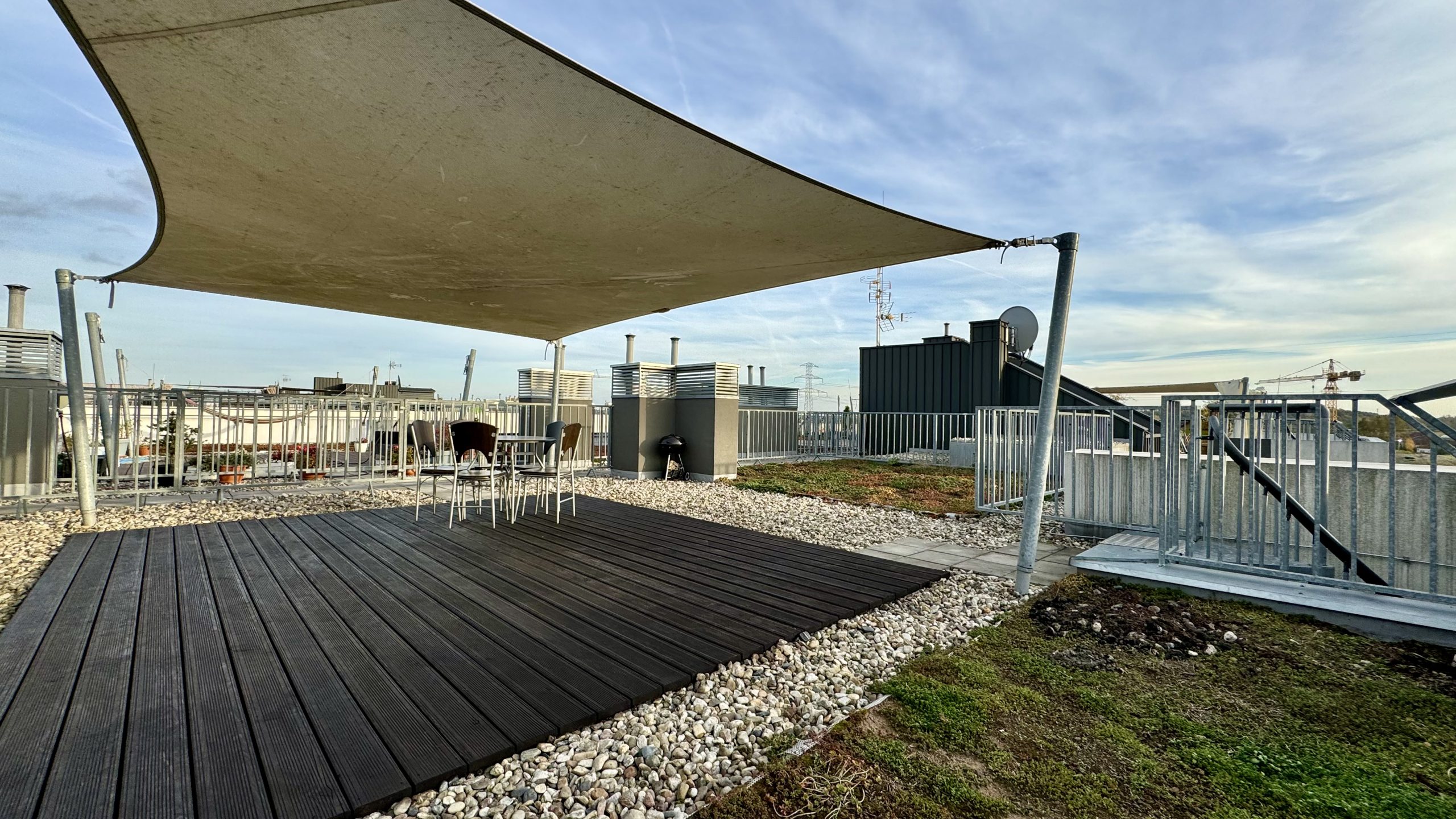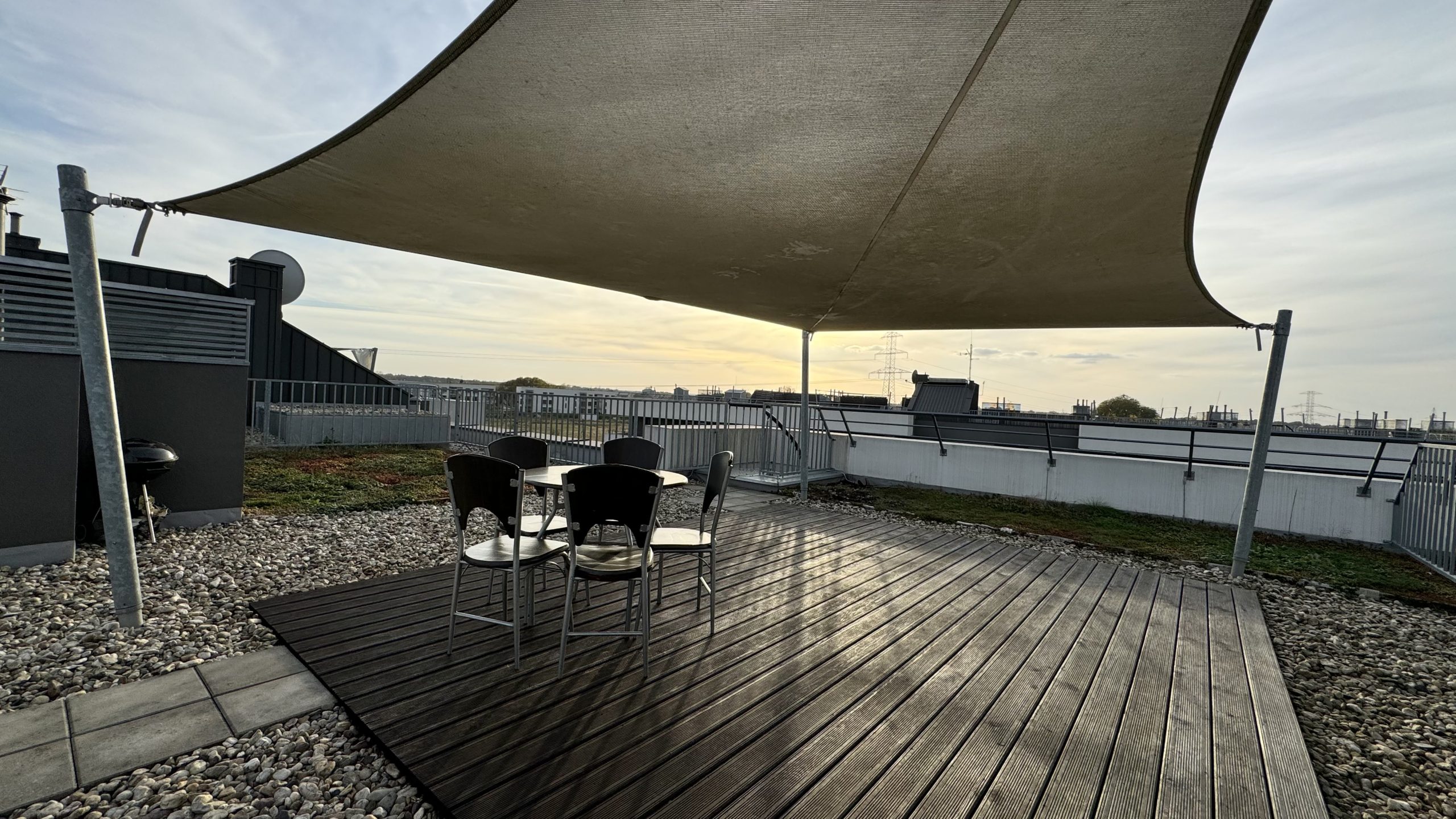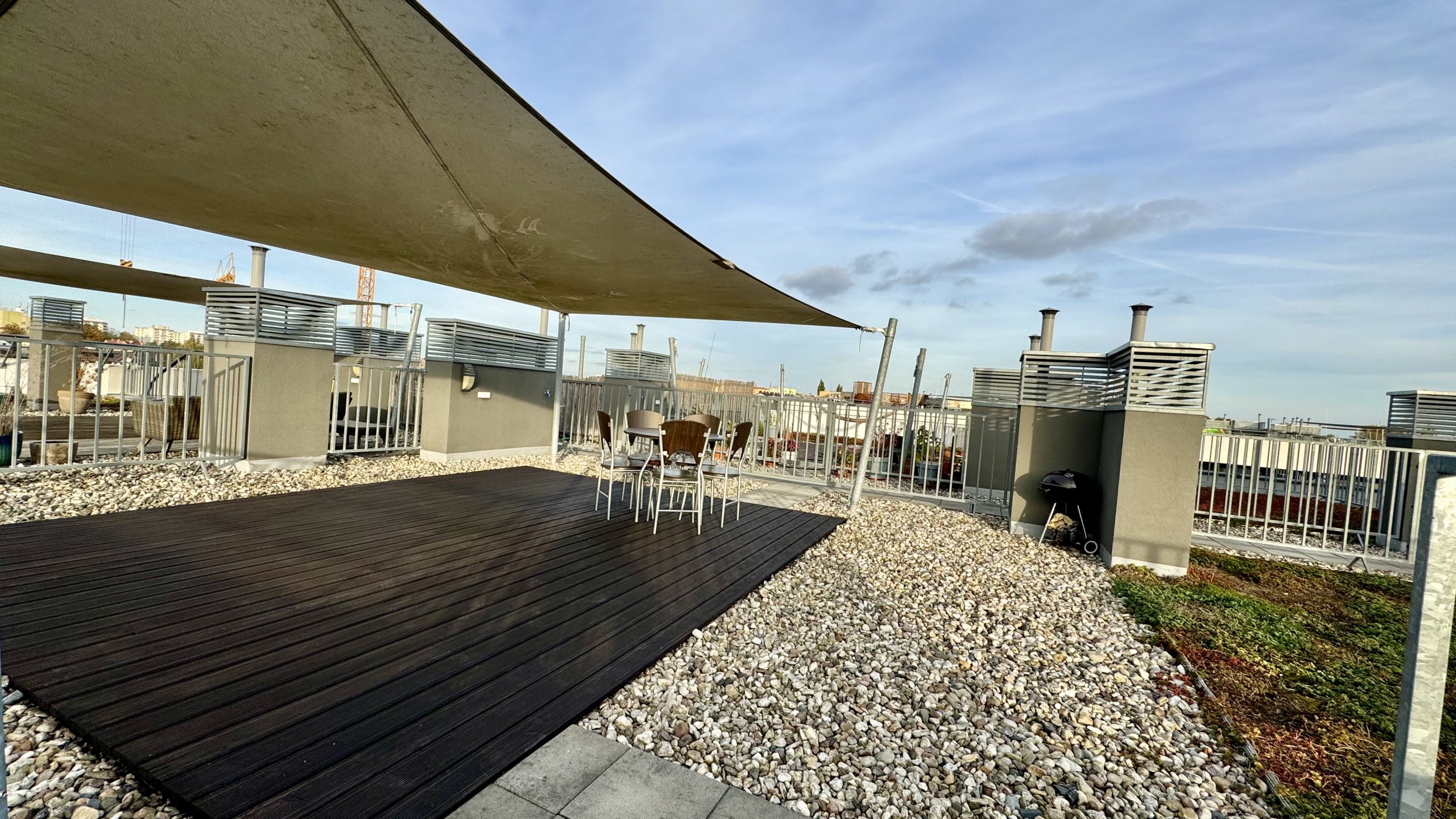 - • Ogromny taras na dachu o powierzchni 60 m², doskonały na spotkania towarzyskie, grillowanie i relaks na świeżym powietrzu. Taras został wykończony naturalną deską modrzewiową i posiada żagiel przeciwsłoneczny. Wyposażenie mieszkania: